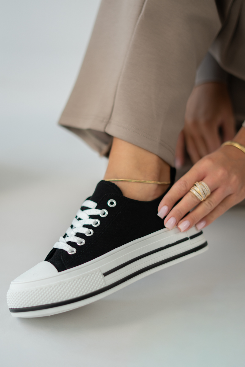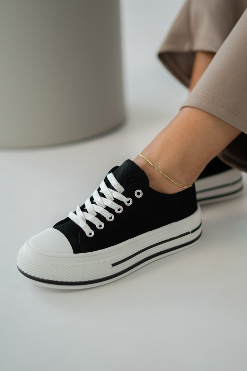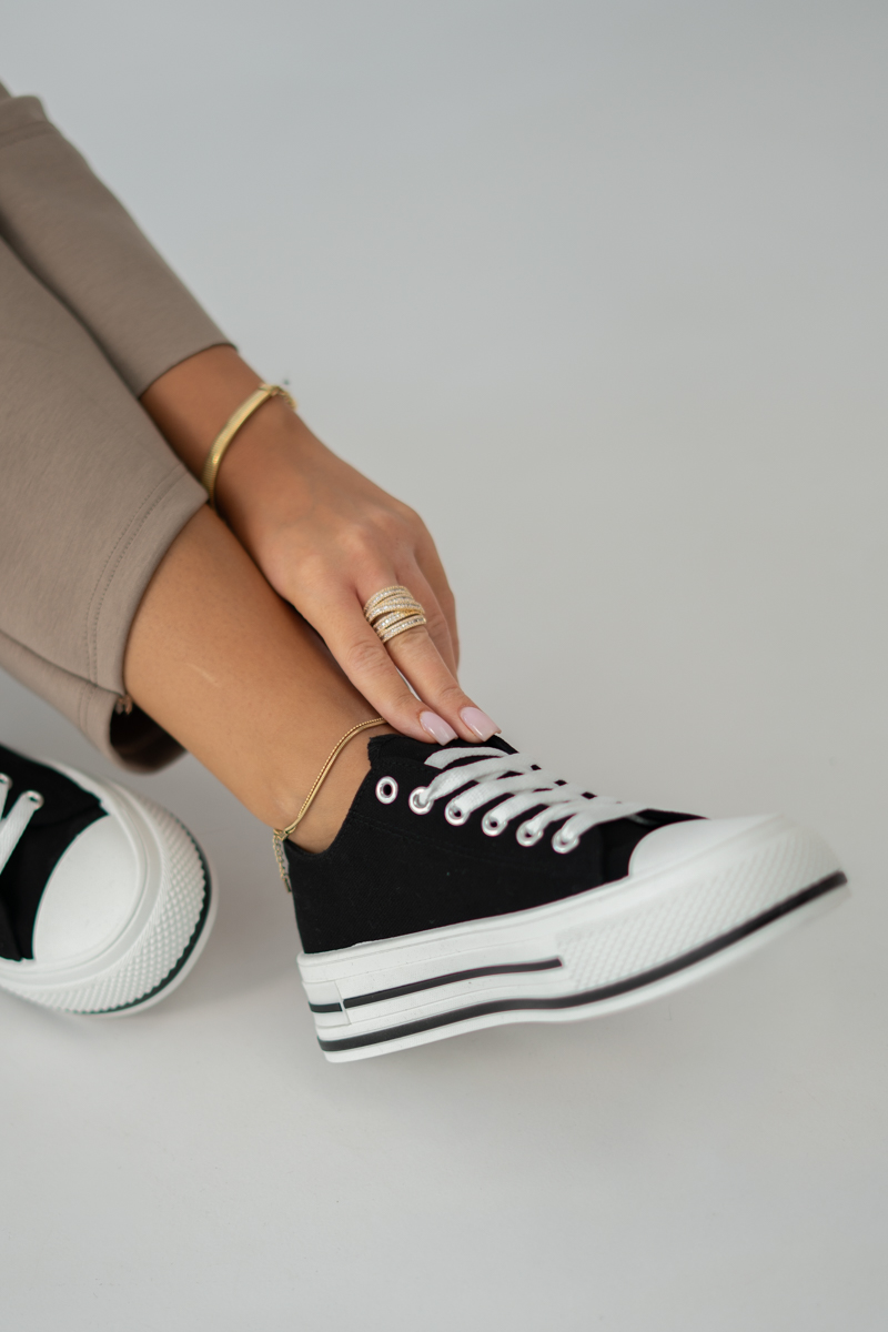 Trampki niskie gładkie Czarne to klasyczne i uniwersalne obuwie, które świetnie sprawdzi się w codziennych stylizacjach. Utrzymane w ponadczasowej czerni, zostały uzupełnione białą podeszwą i czubkiem, co nadaje im sportowego i świeżego charakteru. Klasyczne sznurowanie pozwala na idealne dopasowanie do stopy, a lekka, gumowa podeszwa zapewnia komfort noszenia i swobodę ruchów. To wszechstronny model, który doskonale komponuje się zarówno z jeansami, szortami, jak i sukienkami, dodając stylizacji luzu i młodzieżowego charakteru. Idealny wybór na co dzień dla kobiet ceniących wygodę i prostotę.