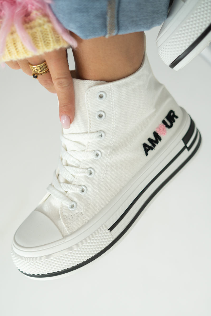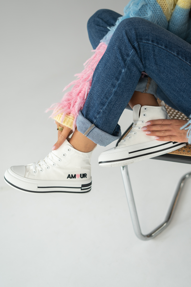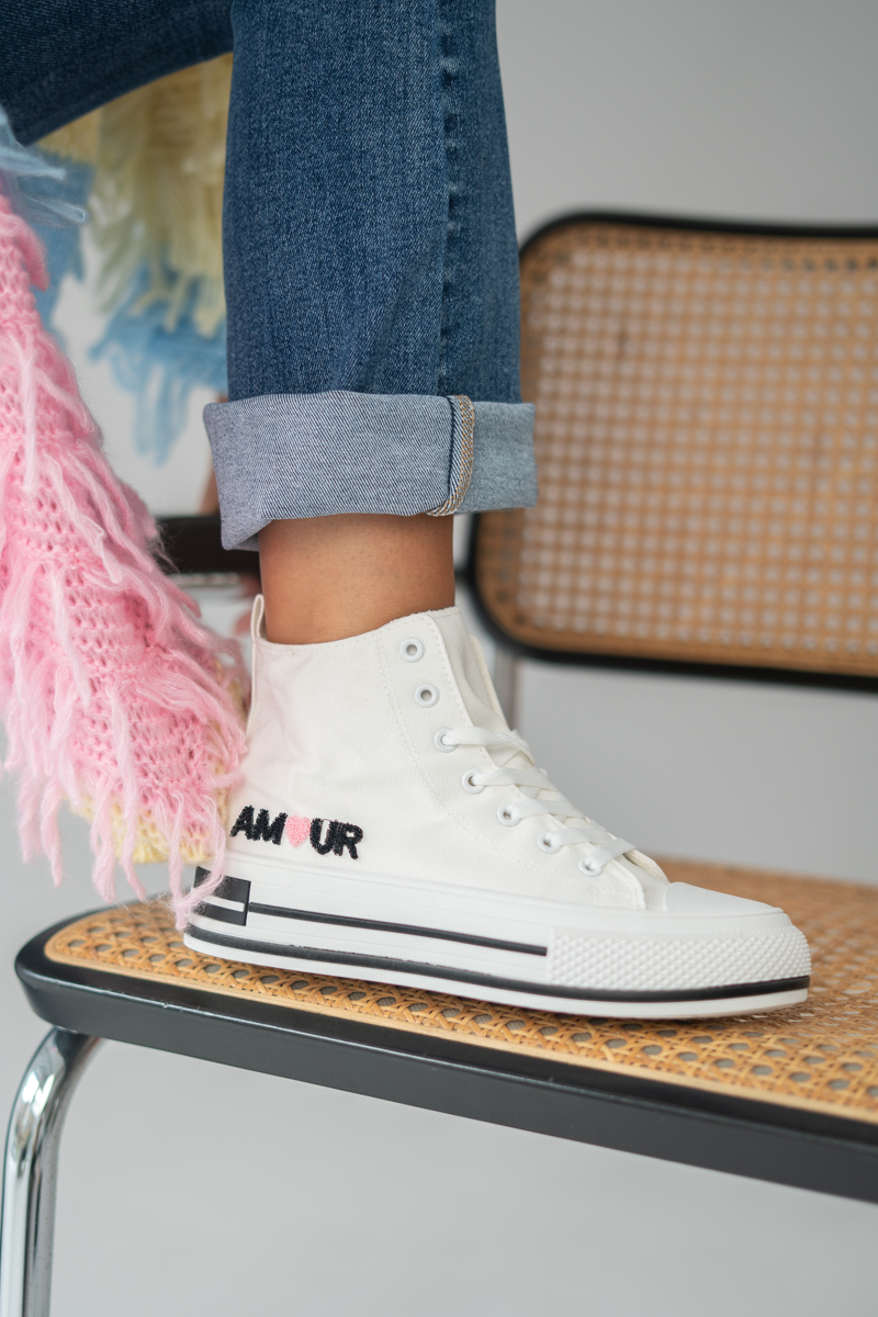 Trampki wysokie z haftem Białe to stylowe i wygodne obuwie, które idealnie sprawdzi się w codziennych, casualowych stylizacjach. Utrzymane w klasycznej bieli, prezentują się świeżo i nowocześnie, a kontrastowe detale oraz ozdobny haft z boku nadają im oryginalnego charakteru. Wysoki fason dobrze stabilizuje kostkę, zapewniając komfort noszenia, a klasyczne sznurowanie pozwala na idealne dopasowanie do stopy. Gumowa podeszwa gwarantuje wygodę i trwałość. To ponadczasowy model, który świetnie komponuje się zarówno z jeansami, jak i z sukienkami czy szortami, dodając stylizacji młodzieżowego luzu.