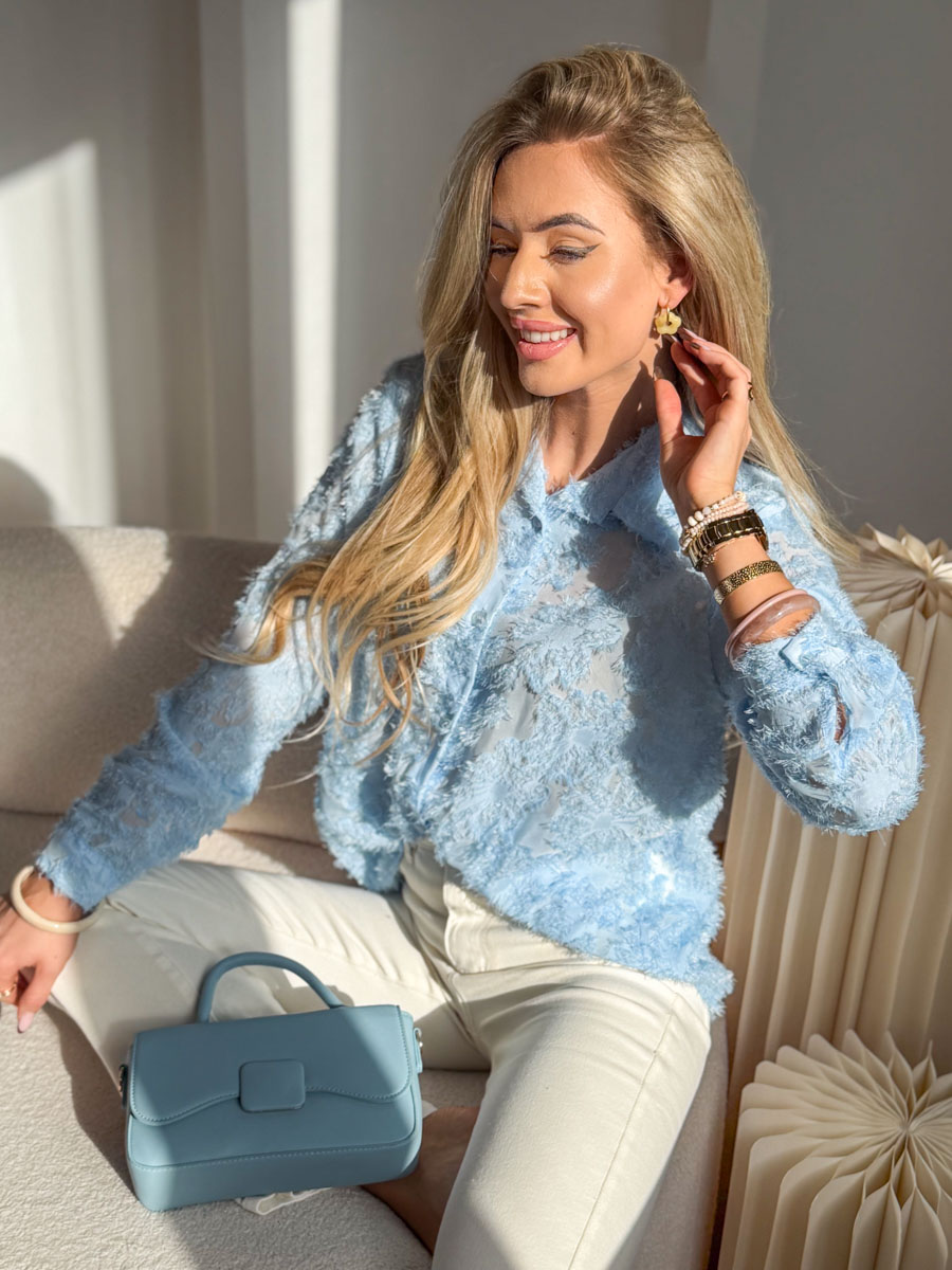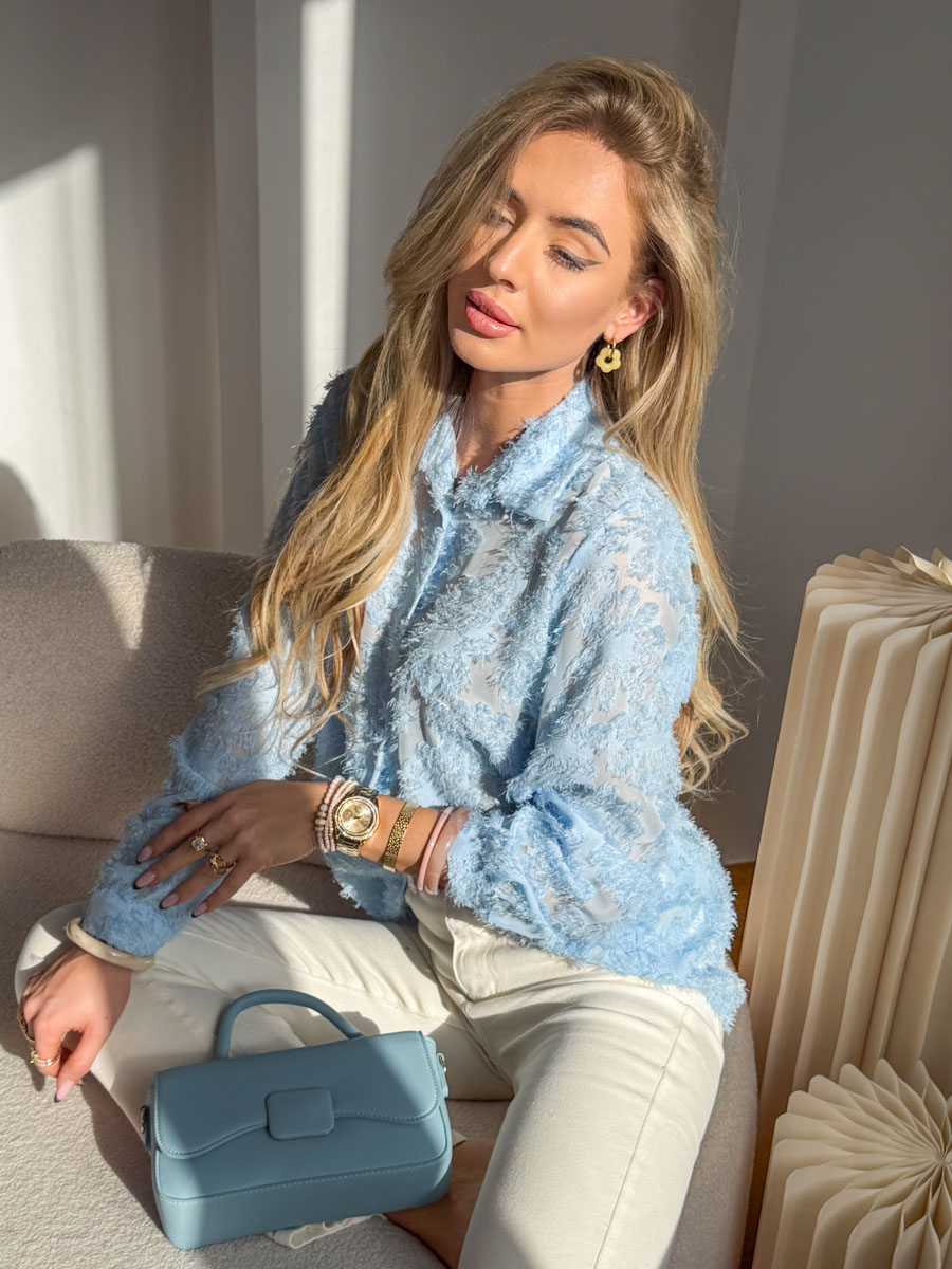 Bluzka strukturalna z kołnierzykiem Błękitny to elegancka i jednocześnie wyjątkowo stylowa propozycja, która przyciąga uwagę oryginalną fakturą materiału. Wykonana z miękkiej, przyjemnej w dotyku tkaniny o wyrazistej, puszystej strukturze, zapewnia komfort noszenia i modny wygląd. Subtelny, błękitny odcień dodaje świeżości oraz lekkości każdej stylizacji. Klasyczny kołnierzyk i zapięcie na guziki nadają całości ponadczasowego charakteru, a swobodny krój pięknie układa się na sylwetce. Model doskonale sprawdzi się zarówno w połączeniu z eleganckimi spodniami, jak i casualowymi jeansami.