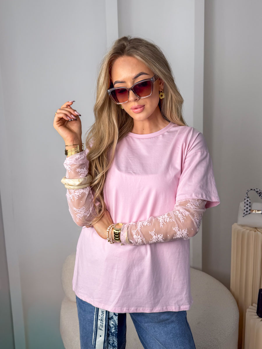 Bluzka Sleevelisse w pudrowym odcieniu to subtelna i kobieca propozycja z efektownym detalem. Wykonana z miękkiego, gładkiego materiału, zapewnia komfort noszenia i swobodę ruchów przez cały dzień. Klasyczny fason z krótkim rękawem został wzbogacony o długie, koronkowe rękawy, które dodają całości elegancji i romantycznego charakteru. Delikatna koronka pięknie kontrastuje z prostą formą bluzki, tworząc stylowy i oryginalny efekt. Pudrowy kolor podkreśla lekkość stylizacji i doskonale komponuje się z jeansami, spódnicą czy eleganckimi spodniami. Idealna na co dzień i na wyjątkowe okazje.