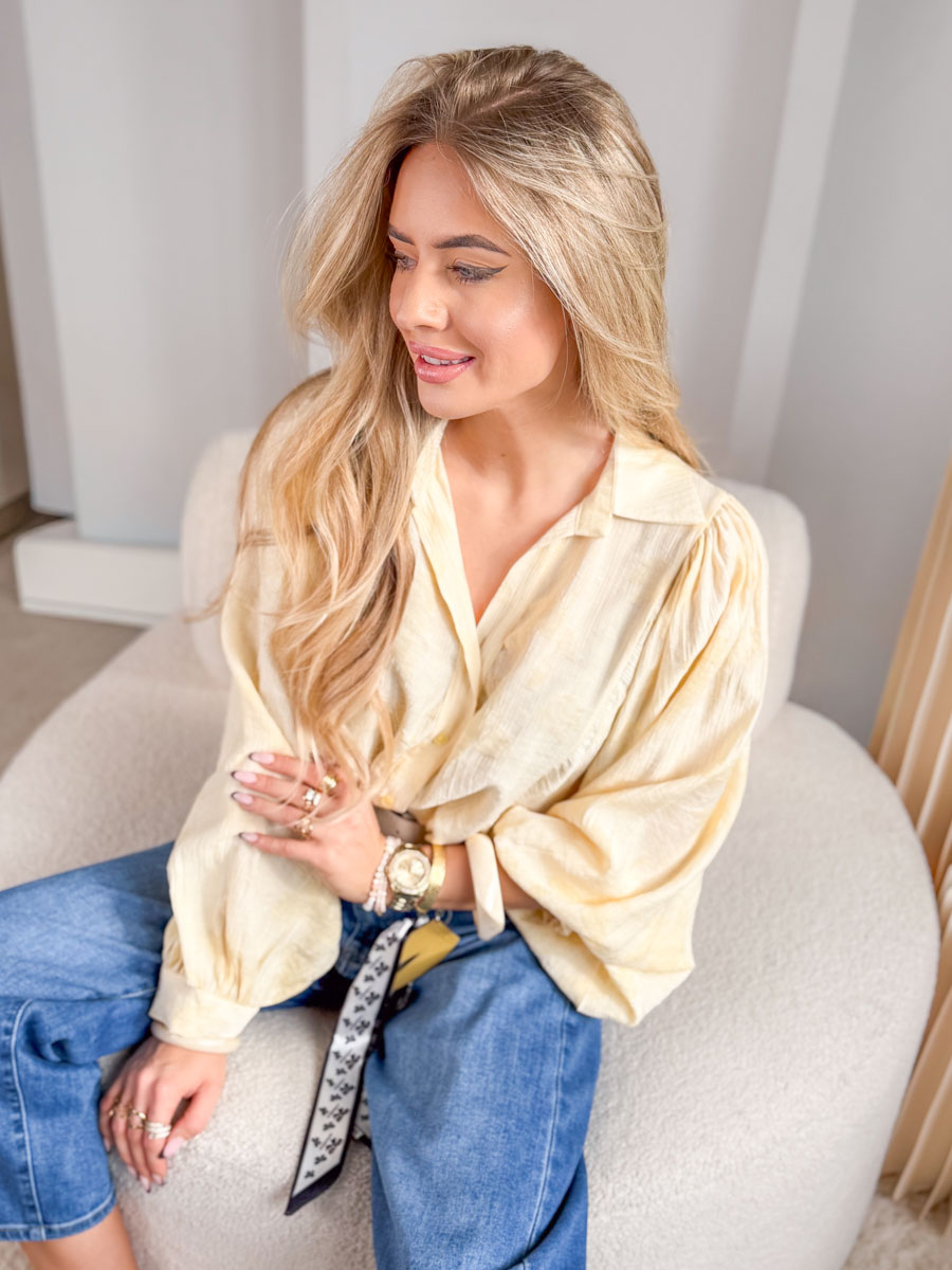 Bluzka damska koszulowa z haftowanymi kwiatami Bananowy to wyjątkowo subtelna i kobieca propozycja w ciepłym, pastelowym odcieniu, który pięknie rozświetla stylizację i dodaje jej świeżości – lekki, delikatnie fakturowany materiał miękko układa się na sylwetce, zapewniając komfort noszenia, a ozdobne haftowane kwiaty nadają całości romantycznego, dopracowanego charakteru; klasyczny kołnierzyk i zapięcie na guziki podkreślają ponadczasowy styl modelu, natomiast delikatnie bufiaste rękawy wprowadzają modny, elegancki akcent, dzięki czemu bluzka świetnie sprawdzi się zarówno w codziennych zestawach z jeansami, jak i w bardziej szykownych stylizacjach na wyjątkowe okazje.