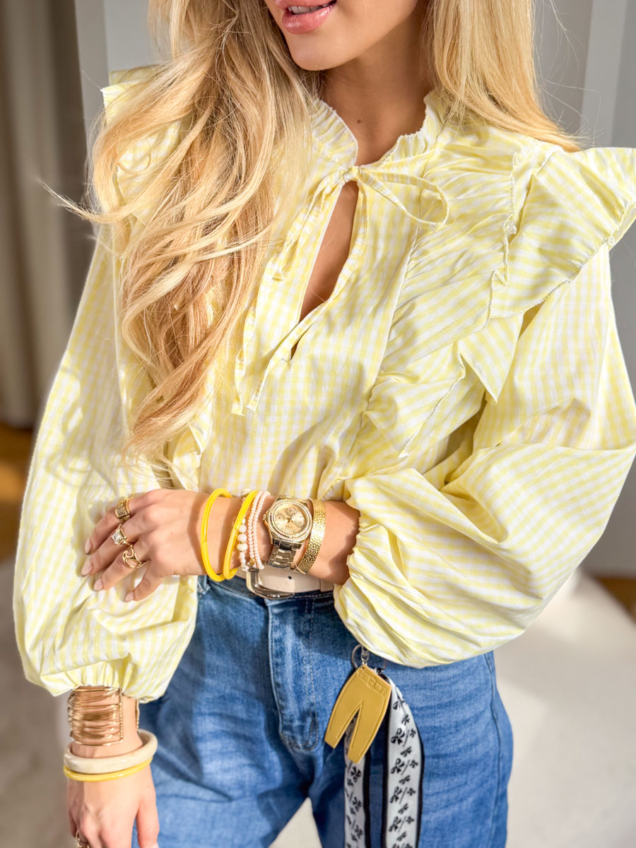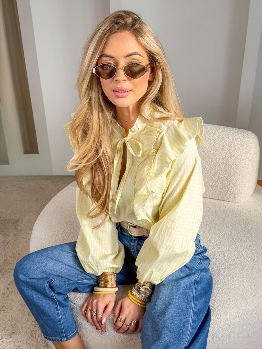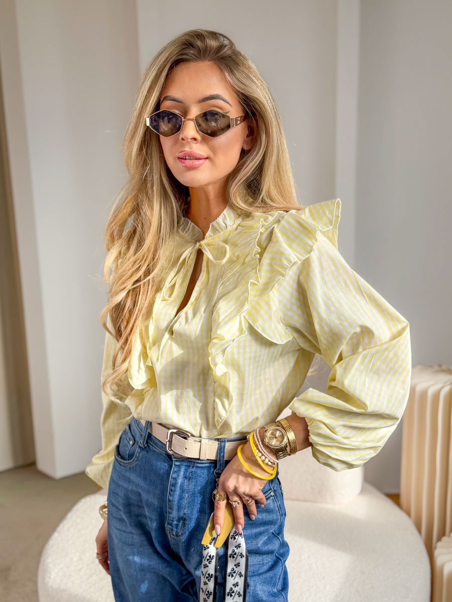 Bluzka koszulowa w kratkę z żabotem Żółty to pełna świeżości i kobiecego uroku propozycja w delikatnym, słonecznym odcieniu – subtelna kratka nadaje jej lekkości, a efektowny żabot oraz falbany przy ramionach podkreślają romantyczny charakter modelu; lekki, przyjemny w dotyku materiał pięknie układa się na sylwetce i zapewnia komfort noszenia, natomiast wiązanie przy dekolcie dodaje elegancji i pozwala dopasować stylizację do okazji, dzięki czemu bluzka doskonale komponuje się zarówno z klasycznymi jeansami, jak i bardziej eleganckimi elementami garderoby.