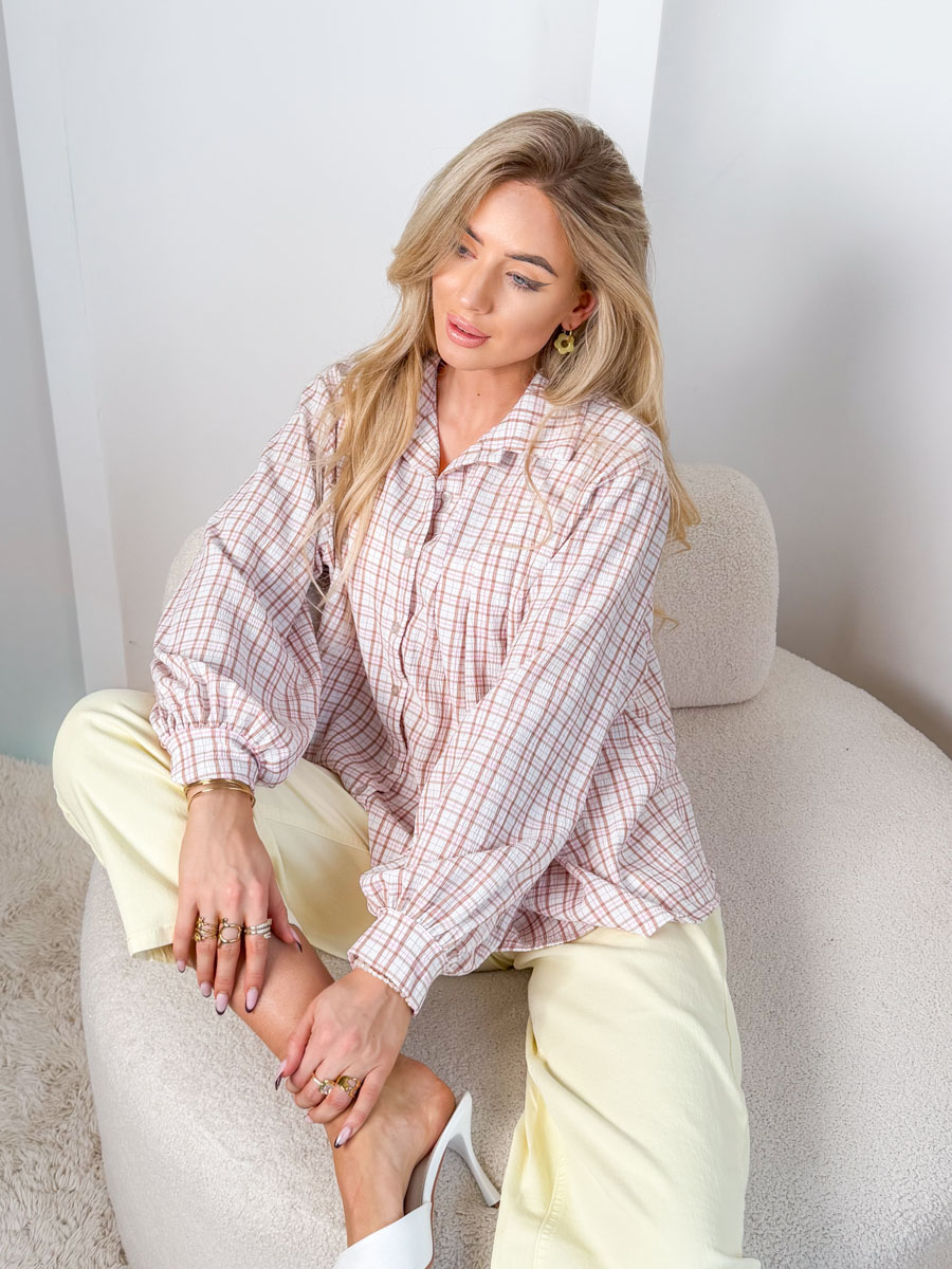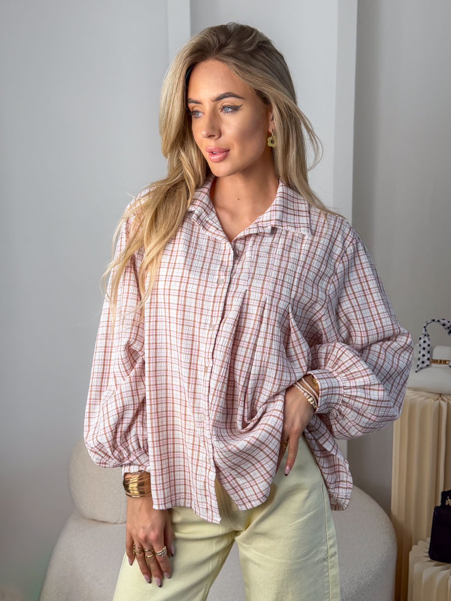Koszula damska w kratę Pudrowy to subtelna i stylowa propozycja w delikatnej, kobiecej kolorystyce – wykonana z lekkiego, przyjemnego w dotyku materiału pięknie układa się na sylwetce, zapewniając komfort noszenia przez cały dzień; klasyczny kołnierzyk i zapięcie na guziki nadają jej ponadczasowego charakteru, natomiast luźniejszy fason z delikatnym marszczeniem dodaje lekkości i swobody, dzięki czemu koszula doskonale sprawdzi się zarówno w codziennych stylizacjach z jeansami, jak i w bardziej eleganckim wydaniu z dopasowanymi spodniami czy spódnicą.