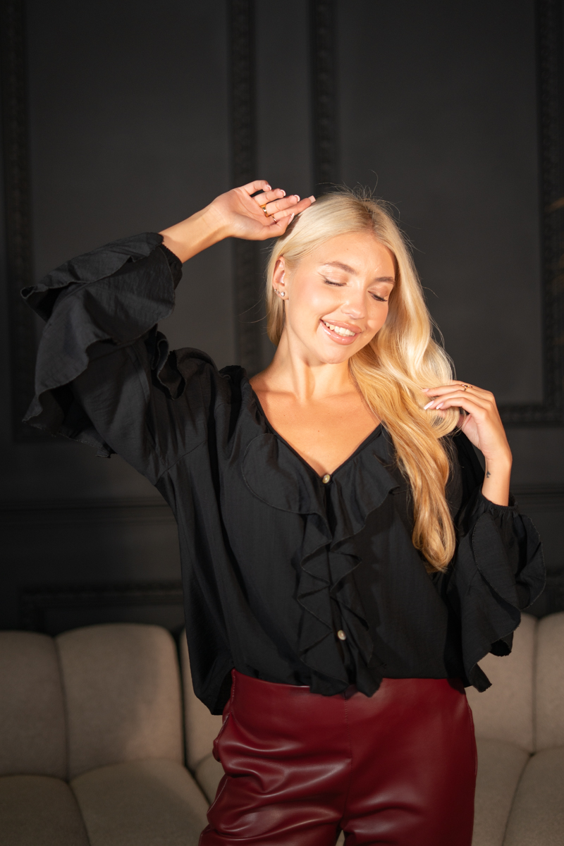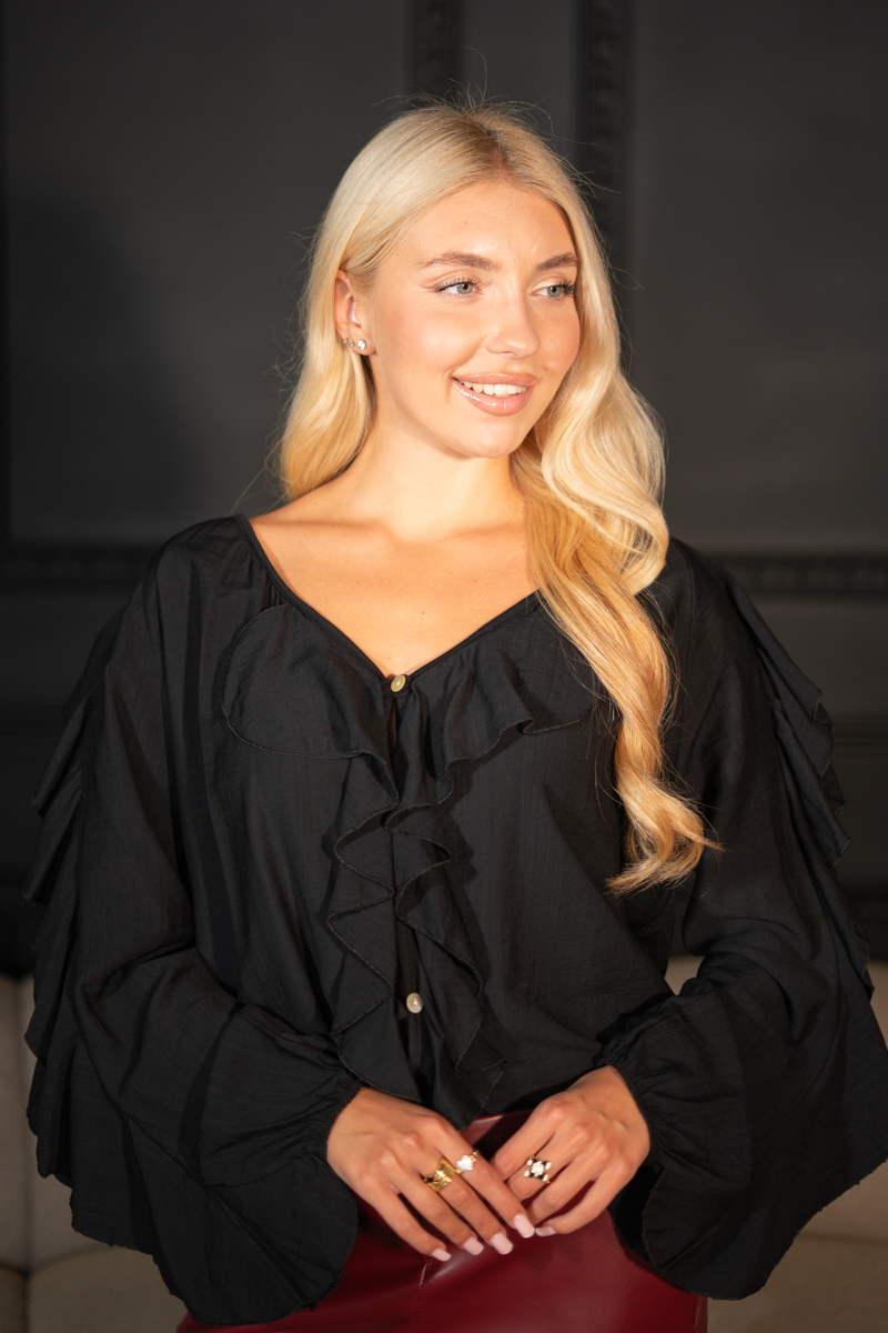 Bluzka damska z falbankami Czarny – Delivra to elegancki i kobiecy model, który sprawdzi się zarówno w codziennych stylizacjach, jak i podczas bardziej wyjątkowych okazji. Wykonana z lekkiej, zwiewnej tkaniny, miękko układa się na sylwetce, a falbanki przy dekolcie i rękawach dodają jej romantycznego i subtelnego charakteru. Klasyczna czerń podkreśla ponadczasowy styl bluzki i sprawia, że łatwo można ją zestawić zarówno z jeansami, jak i ze spódnicą czy eleganckimi spodniami. To propozycja, która łączy wygodę noszenia z modnym, kobiecym akcentem, idealna dla kobiet ceniących uniwersalność i szyk.