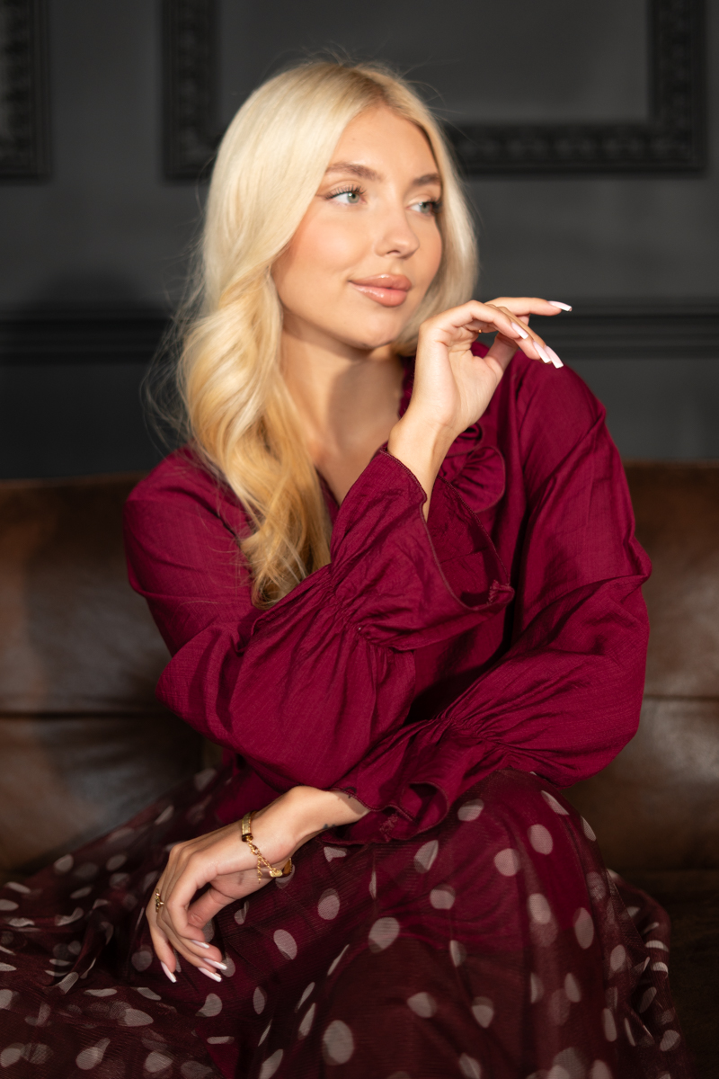 Bluzka z kwiatem przy dekolcie Bordowy – Florivellea to kobieca i elegancka propozycja, która wyróżnia się subtelnymi detalami. Wykonana z lekkiego, przewiewnego materiału, zapewnia komfort noszenia i pięknie układa się na sylwetce. Jej prosty fason został przełamany dekoracyjnym kwiatem z falbanek umieszczonym przy dekolcie, który dodaje całości romantycznego i wyjątkowego charakteru. Bordowy kolor podkreśla elegancję i sprawia, że bluzka świetnie sprawdzi się zarówno w stylizacjach codziennych, jak i bardziej uroczystych. To model, który można z powodzeniem zestawić z klasycznymi spodniami, ołówkową spódnicą czy marynarką, tworząc szykowny i ponadczasowy look.