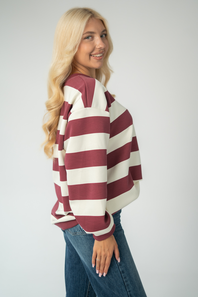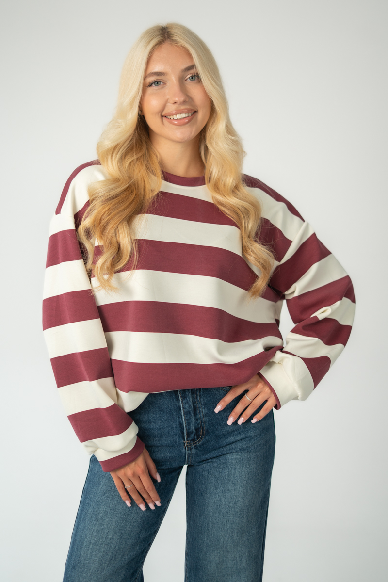 Bluza w paski oversize Bordowy – Olivarra to wygodny i stylowy model, który świetnie wpisuje się w casualowe stylizacje. Szerokie bordowo-kremowe pasy dodają jej charakteru i sprawiają, że prezentuje się świeżo oraz modnie. Luźny krój oversize gwarantuje pełen komfort noszenia i swobodę ruchów, a jednocześnie nadaje bluzie lekko niedbałego, streetwearowego uroku. Doskonale sprawdzi się w codziennych zestawach z jeansami, szortami czy legginsami – idealna propozycja dla kobiet ceniących wygodę połączoną z modnym akcentem.