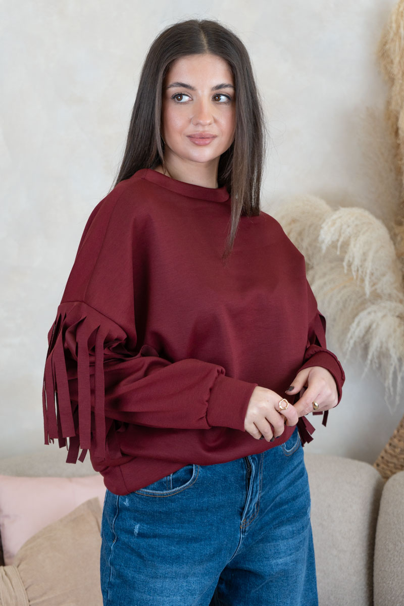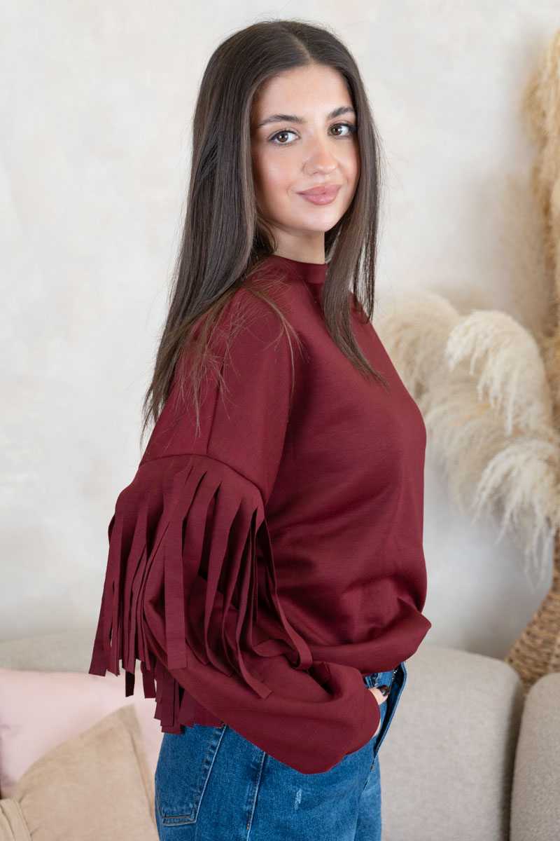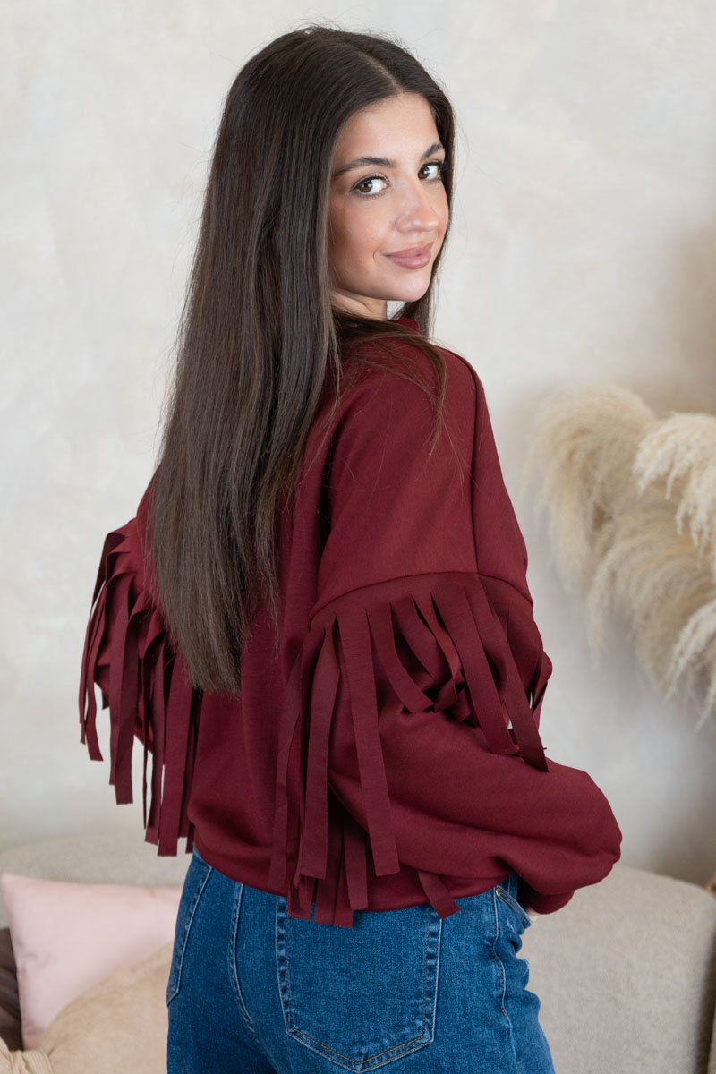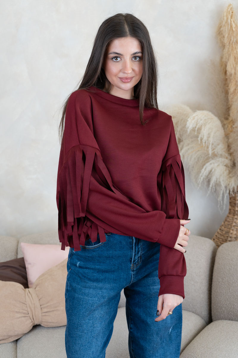 Bluza z frędzlami na rękawach Bordowy – Frendelle to stylowy model, który łączy prostotę z efektownym detalem. Klasyczny, swobodny krój został urozmaicony frędzlami na rękawach, co nadaje bluzie oryginalnego i modnego charakteru. Wykonana z miękkiego materiału, zapewnia wygodę i komfort noszenia. Bordowy odcień dodaje całości elegancji, dzięki czemu bluza sprawdzi się zarówno w codziennych stylizacjach, jak i w bardziej wyrazistych zestawach na specjalne okazje.