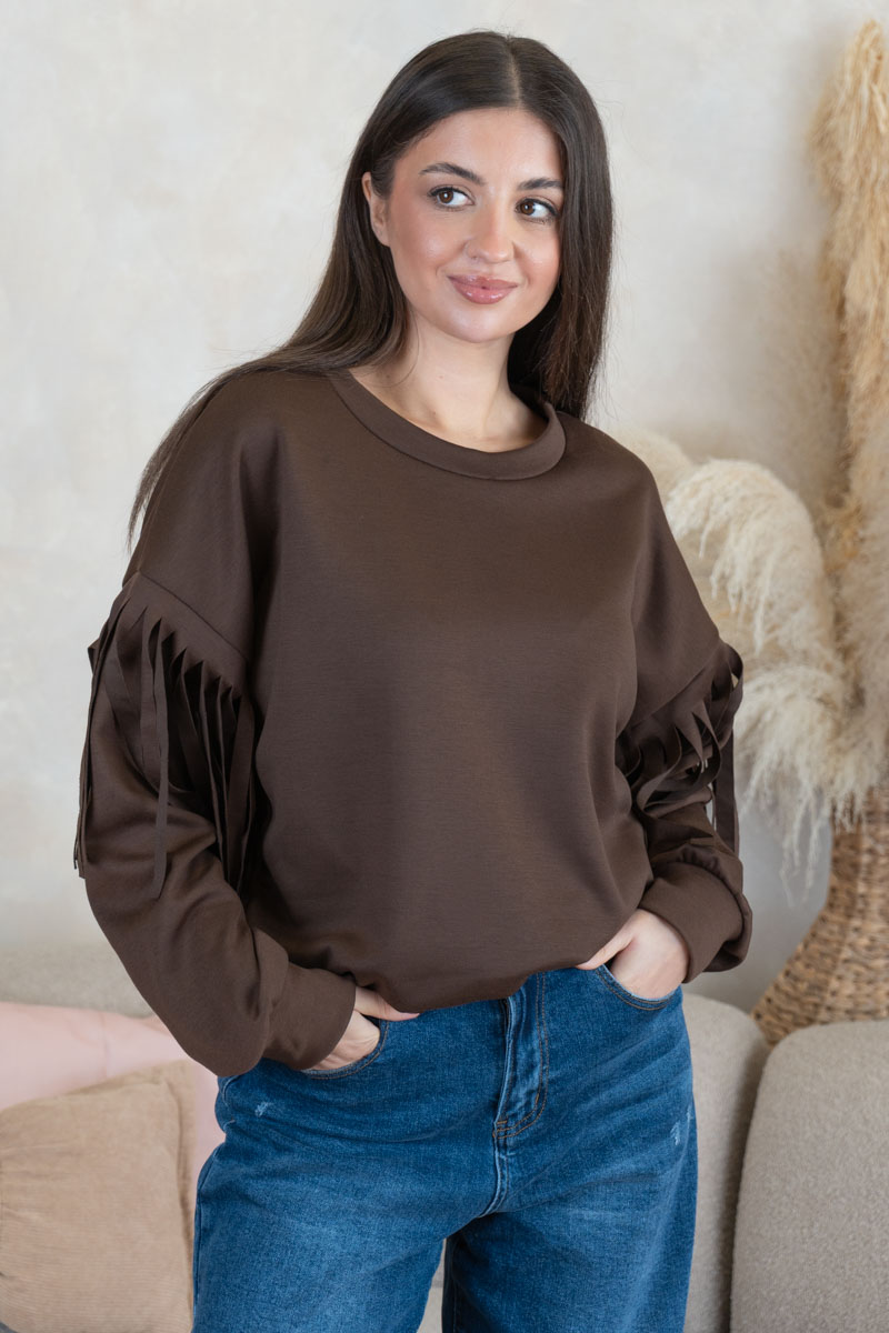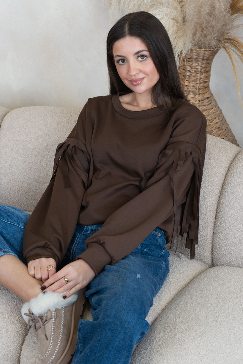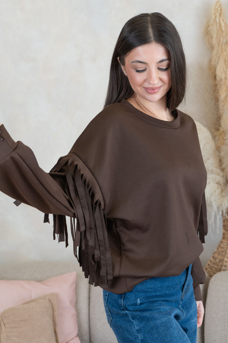 Bluza z frędzlami na rękawach Czekoladowy – Frendelle