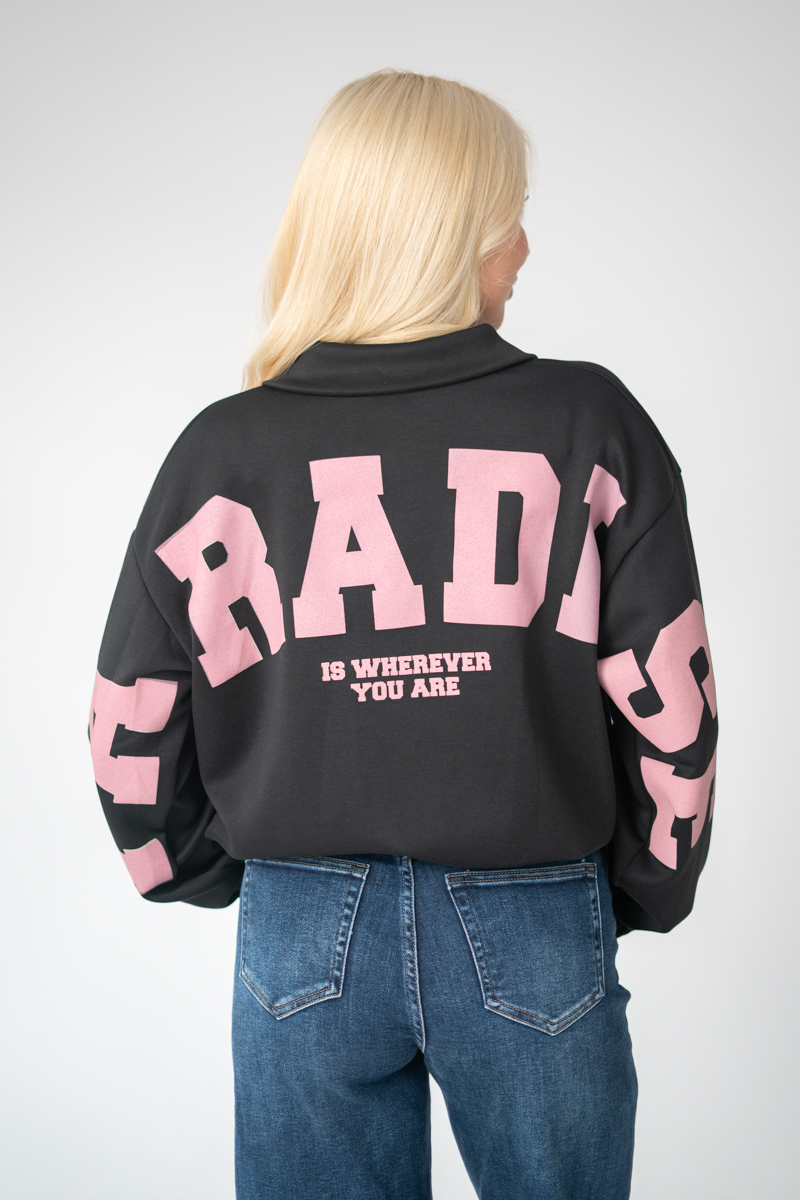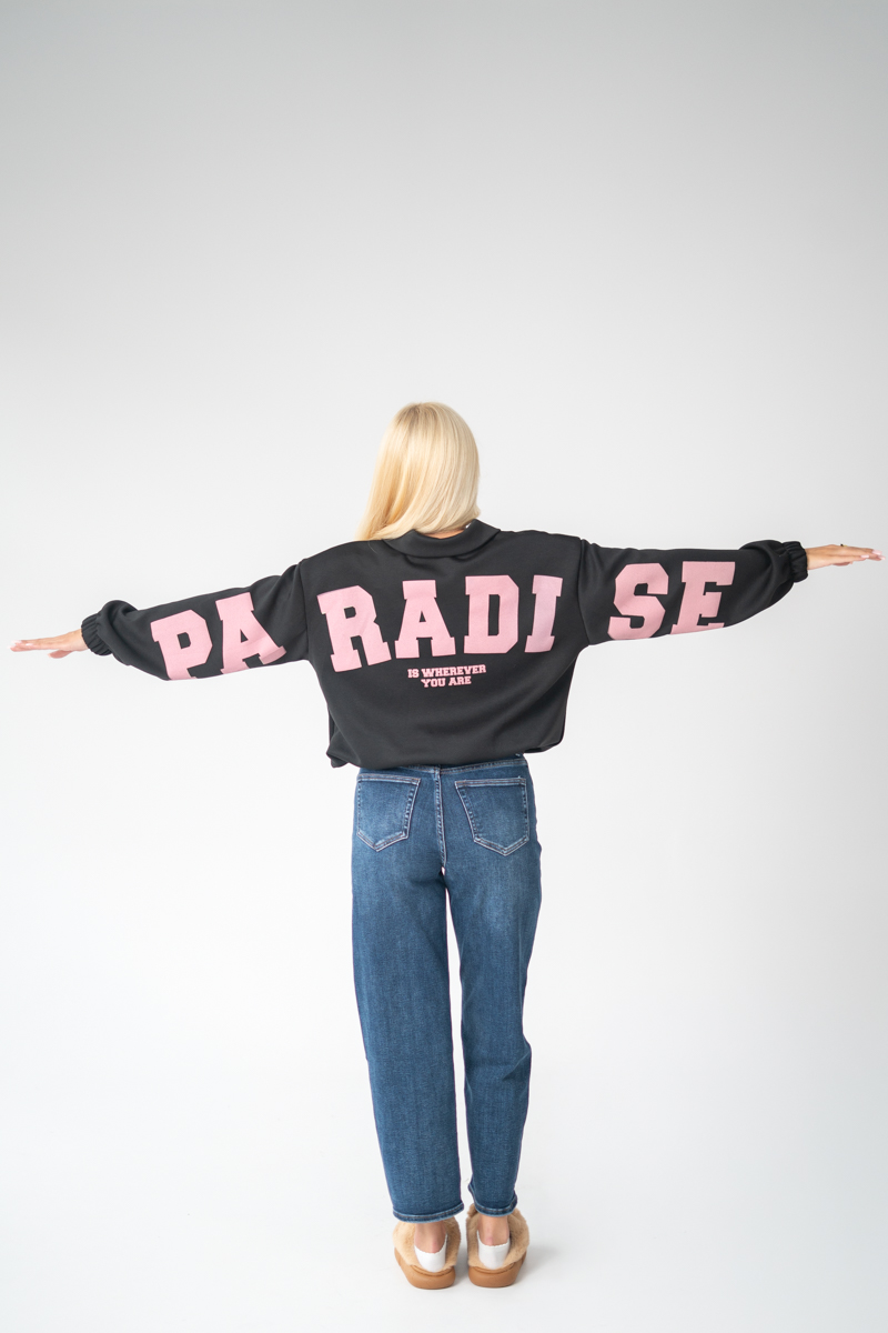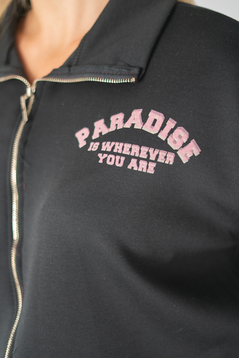 Bluza rozpinana z kołnierzem Czarny – Paradise to modna propozycja w sportowym stylu, która łączy komfort i nowoczesny design. Wykonana w klasycznej czerni, została ozdobiona nadrukiem „Paradise is wherever you are” na piersi, co nadaje jej oryginalnego charakteru. Zamek błyskawiczny na całej długości i kołnierz sprawiają, że bluza jest praktyczna i uniwersalna, a elastyczne ściągacze w pasie i przy rękawach gwarantują wygodne dopasowanie. Idealna do jeansów, joggerów czy legginsów – świetnie sprawdzi się w codziennych stylizacjach w sportowym klimacie.