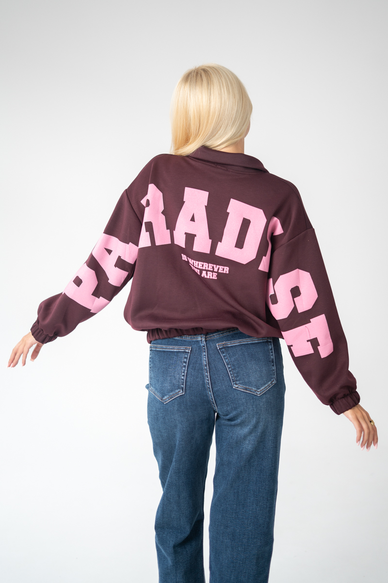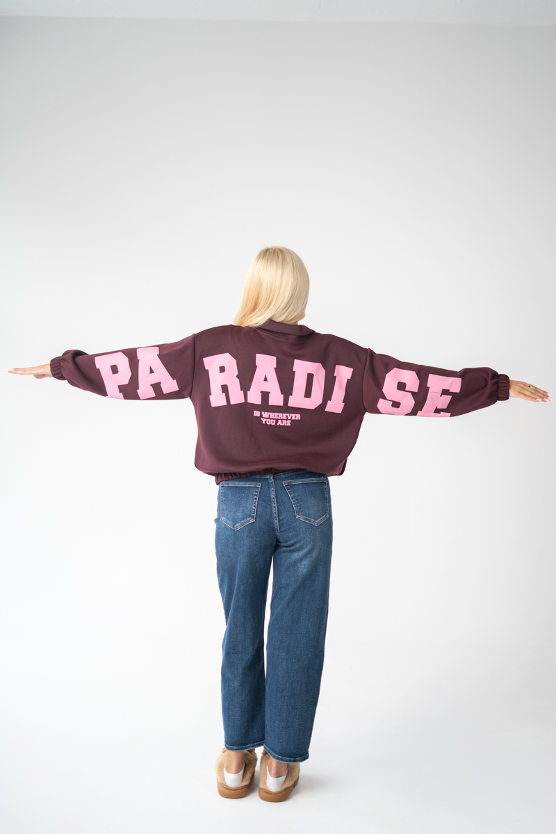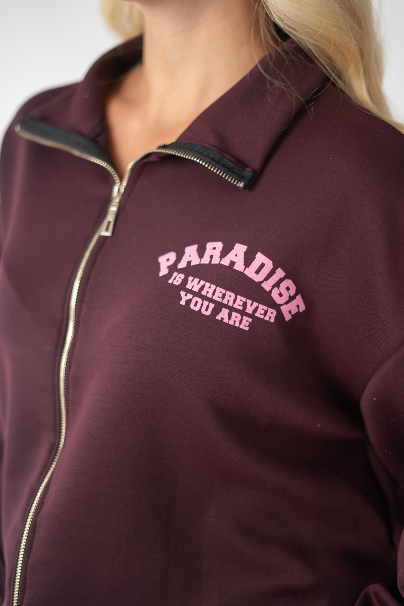 Bluza rozpinana z kołnierzem Śliwkowy – Paradise to wyjątkowy model, który łączy wygodę i modny design. W głębokim, śliwkowym odcieniu prezentuje się niezwykle stylowo, a różowy nadruk „Paradise is wherever you are” nadaje jej świeżości i energii. Bluza posiada praktyczny zamek błyskawiczny, kołnierz oraz elastyczne ściągacze w pasie i przy mankietach, co zapewnia idealne dopasowanie i komfort noszenia. Doskonała na co dzień – sprawdzi się zarówno w sportowych, jak i casualowych stylizacjach, podkreślając Twój indywidualny styl.