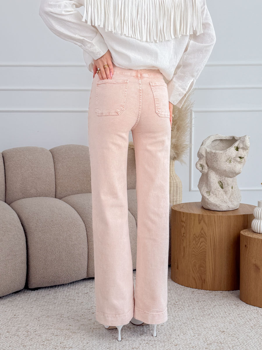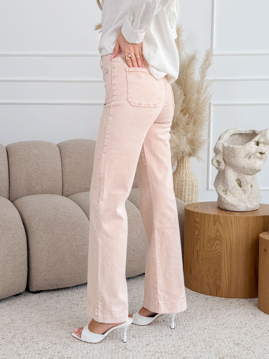 Spodnie jeansowe z ozdobnymi guzikami i kieszeniami Pudrowe – Buttonique