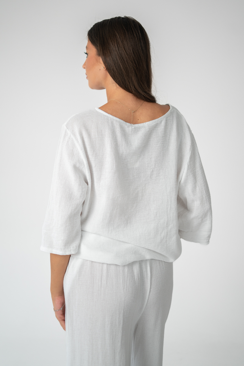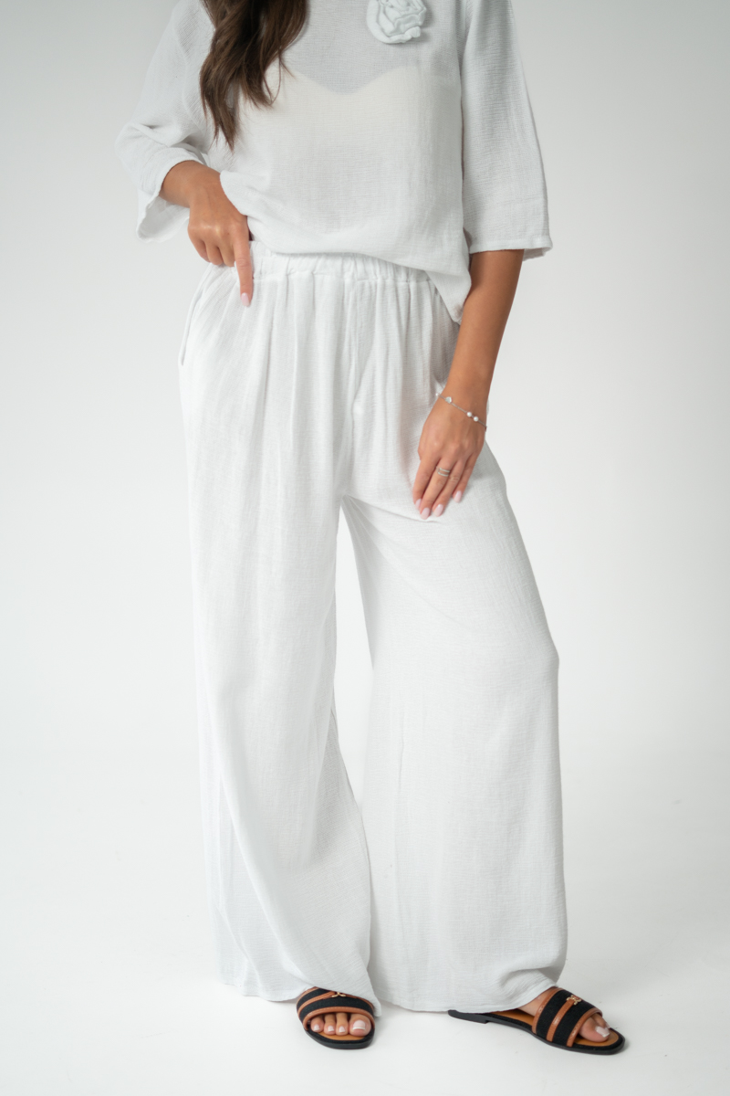 Komplet z bawełny w kolorze białym z ozdobną różą to elegancka i wygodna propozycja na co dzień. Wykonany z naturalnej, przewiewnej tkaniny, zapewnia komfort noszenia i swobodę ruchów. Bluzka z krótkim rękawem ozdobiona aplikacją w formie róży dodaje całości subtelnego, kobiecego akcentu, a jej luźny fason świetnie maskuje drobne niedoskonałości sylwetki. Spodnie w zestawie tworzą spójną i praktyczną całość, idealną na letnie dni. To uniwersalny komplet, który sprawdzi się zarówno w casualowych stylizacjach, jak i podczas bardziej eleganckich okazji, łącząc prostotę z delikatną ozdobnością.