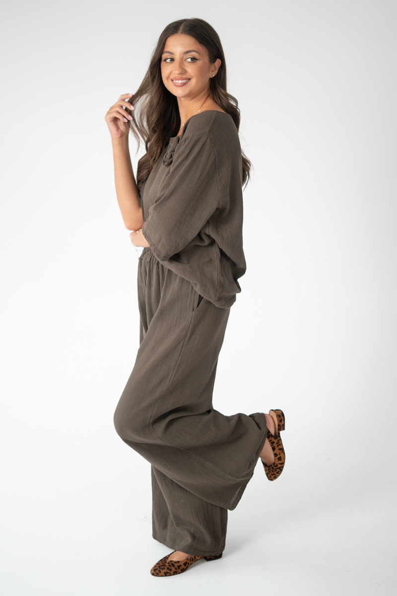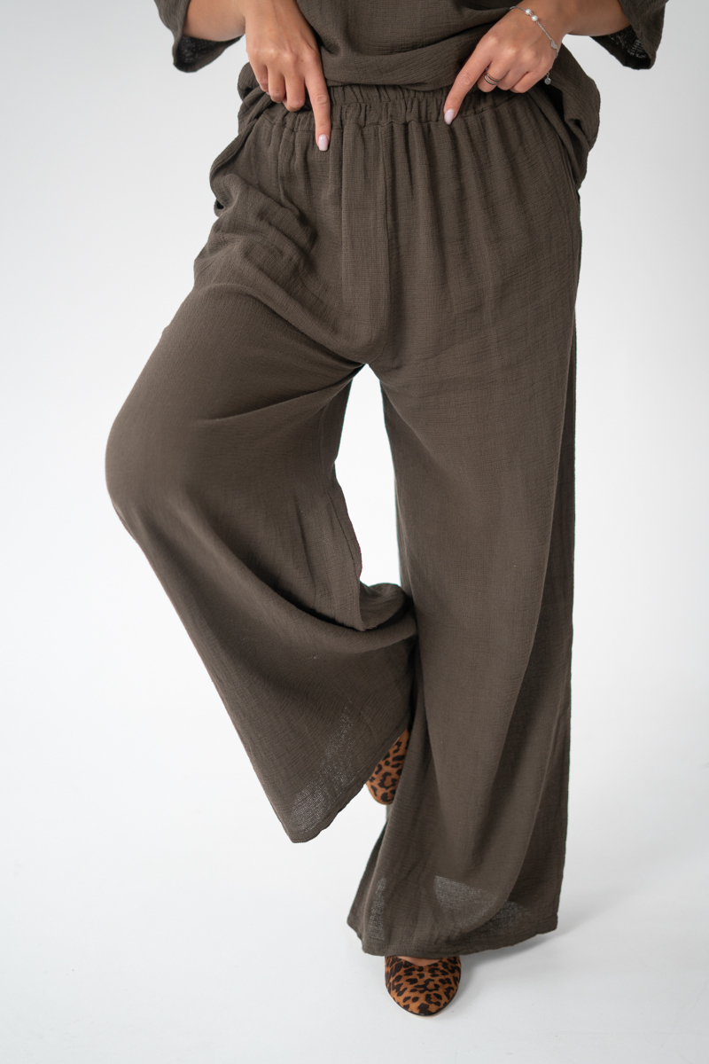 Komplet z bawełny w kolorze czekoladowym z ozdobną różą to elegancka i wygodna propozycja, idealna na co dzień. Wykonany z naturalnej, przewiewnej tkaniny, zapewnia komfort noszenia i swobodę ruchów. Bluzka z krótkim rękawem, ozdobiona aplikacją w formie róży, dodaje całości subtelnego i kobiecego charakteru. Luźny fason gwarantuje wygodę, a jednocześnie świetnie prezentuje się na sylwetce. Spodnie w komplecie tworzą spójną całość, dzięki czemu zestaw sprawdzi się zarówno na spacery, spotkania ze znajomymi, jak i w domowym zaciszu. To praktyczny wybór, który łączy prostotę z nutą elegancji.
