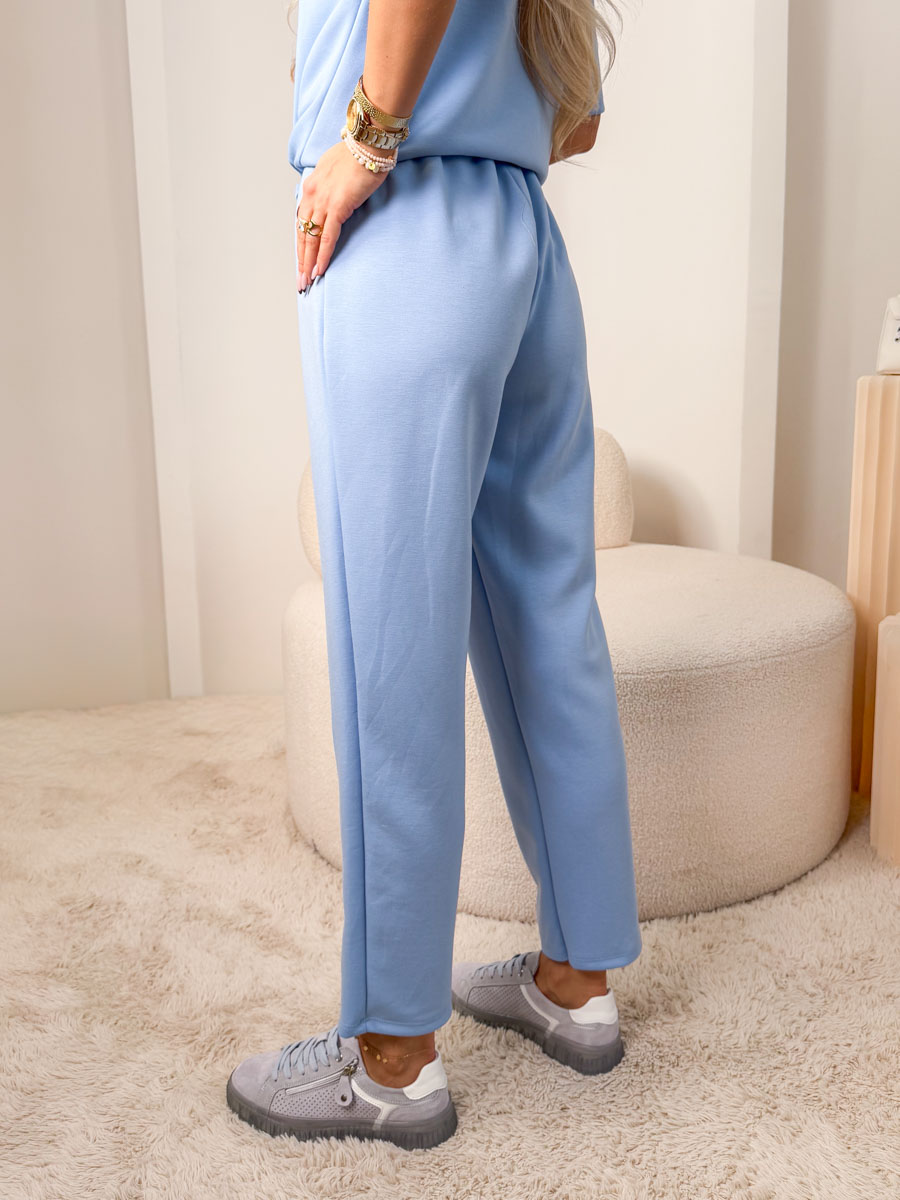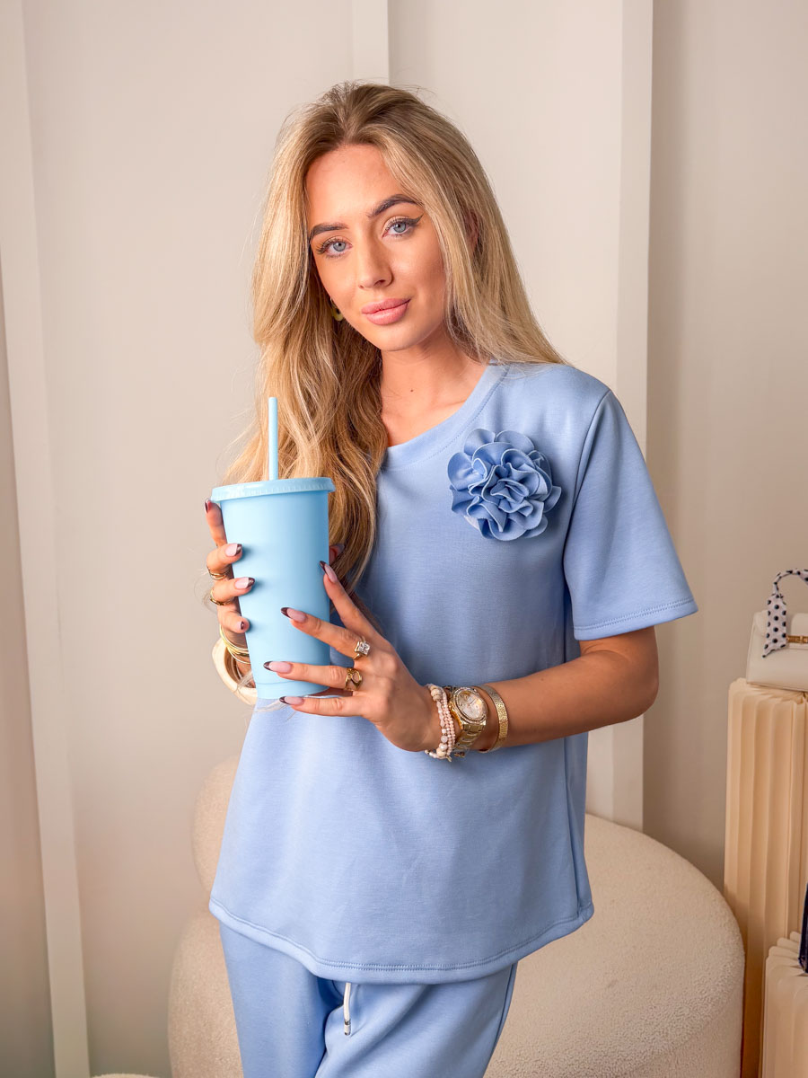 Komplet damski z dekoltem łódka + aplikacją róży Błekitny – Floréline