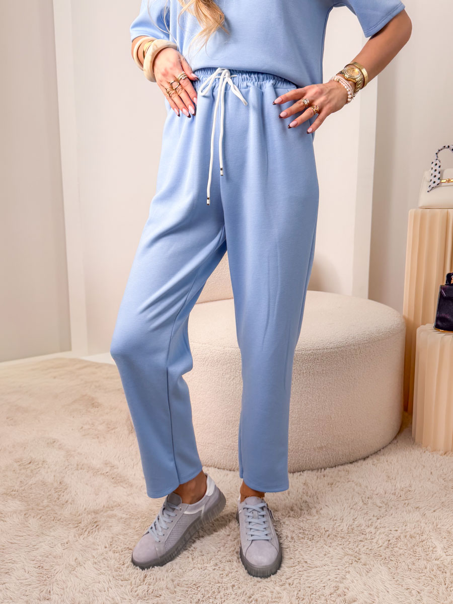 Komplet damski Floréline w delikatnym błękitnym odcieniu to stylowa i wygodna propozycja na co dzień. Bluzka z dekoltem typu łódka subtelnie podkreśla linię szyi i ramion, nadając sylwetce lekkości i kobiecego charakteru. Ozdobna aplikacja w formie róży na przodzie przyciąga wzrok i dodaje całości wyjątkowego uroku. W zestawie znajdują się dopasowane, komfortowe spodenki, które zapewniają swobodę ruchów. Gładki, przyjemny w dotyku materiał sprawia, że komplet doskonale sprawdzi się zarówno w casualowych stylizacjach, jak i podczas letniego relaksu.