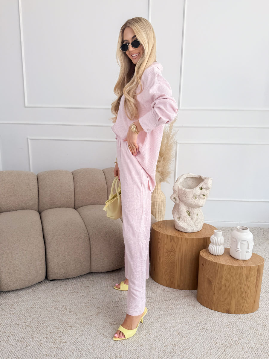 Komplet elegancki: koszula i luźne spodnie z haftowaniem Różowy – Embro Elegance