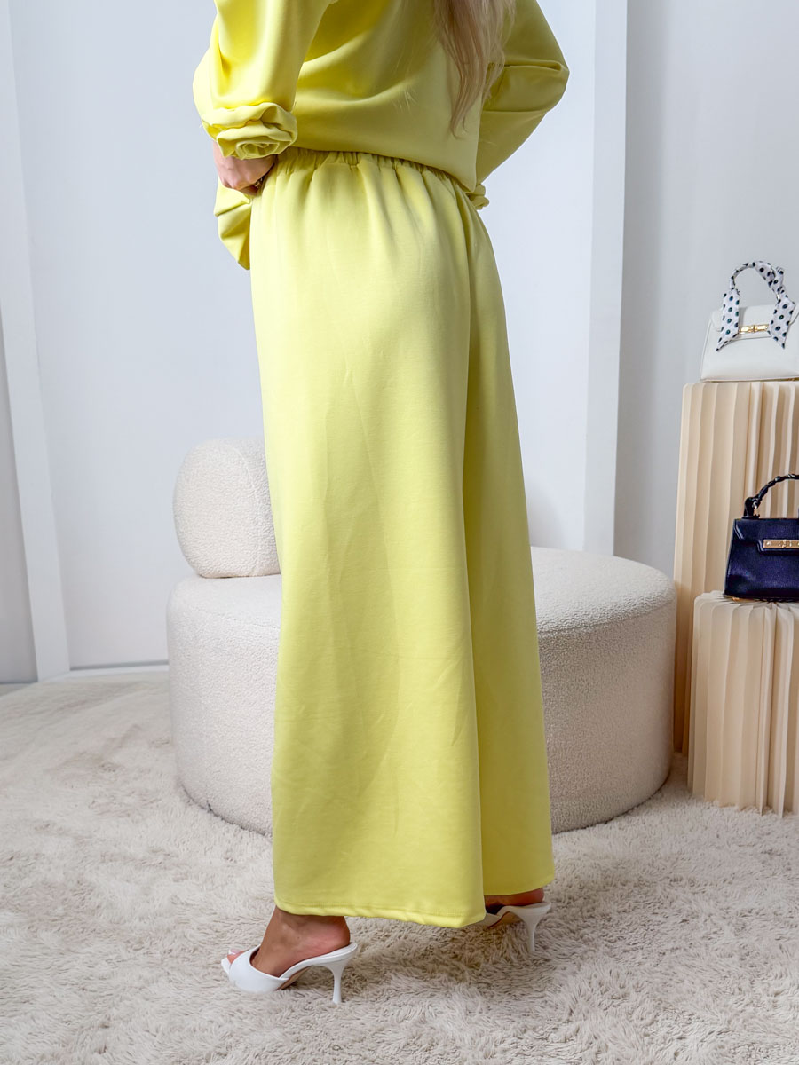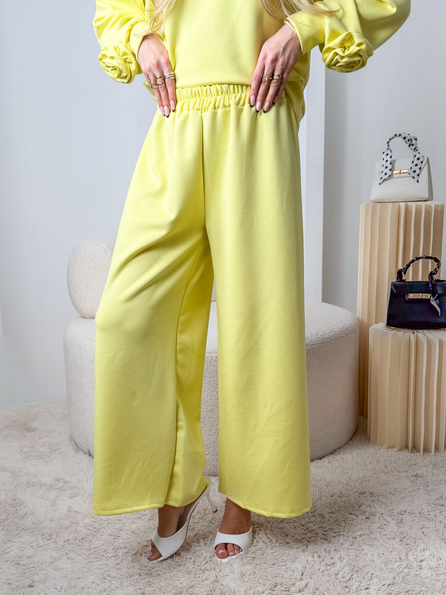 Komplet masełkowy: bluza z różą + rozkloszowane spodnie Bananowy to wyjątkowo świeża i energetyczna propozycja w modnym, cytrynowym odcieniu, która łączy komfort noszenia z kobiecym detalem – wykonany z miękkiej, przyjemnej w dotyku dzianiny o gładkim, „masełkowym” wykończeniu zapewnia wygodę przez cały dzień, a bluza o swobodnym kroju z efektowną aplikacją w formie róży dodaje stylizacji subtelnej elegancji; rozkloszowane spodnie pięknie układają się na sylwetce, optycznie wydłużają nogi i nadają całości lekkości, dzięki czemu zestaw doskonale sprawdzi się zarówno w codziennych stylizacjach, jak i w bardziej dopracowanym, casualowym wydaniu.