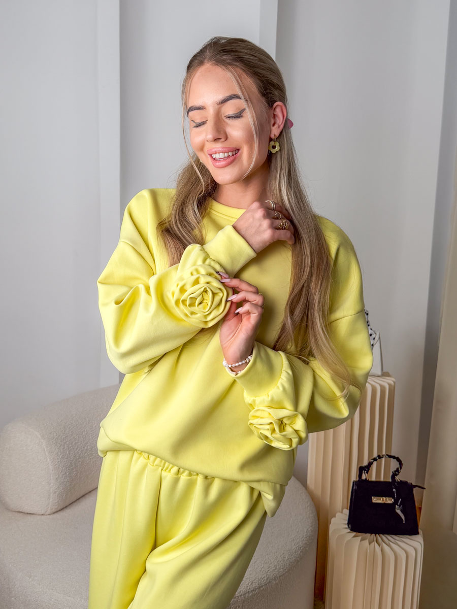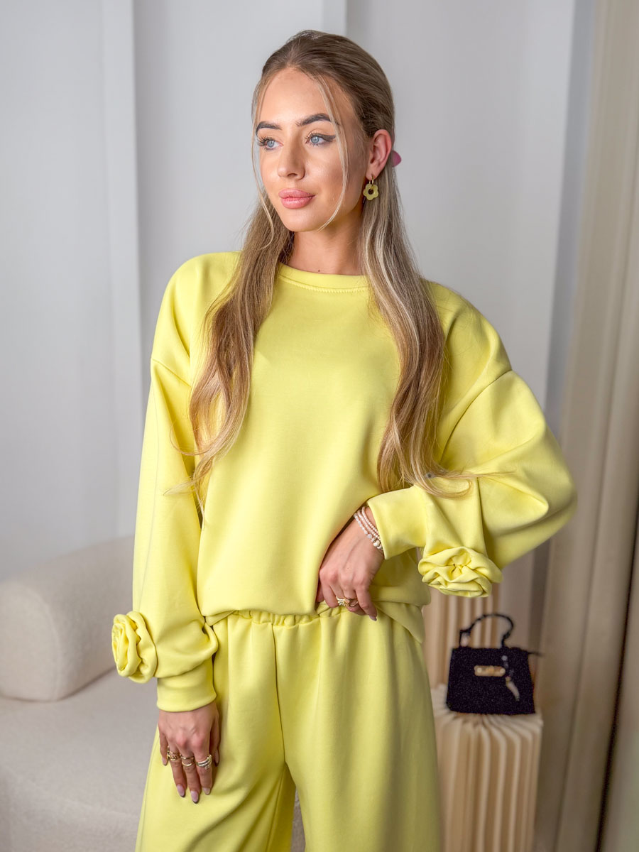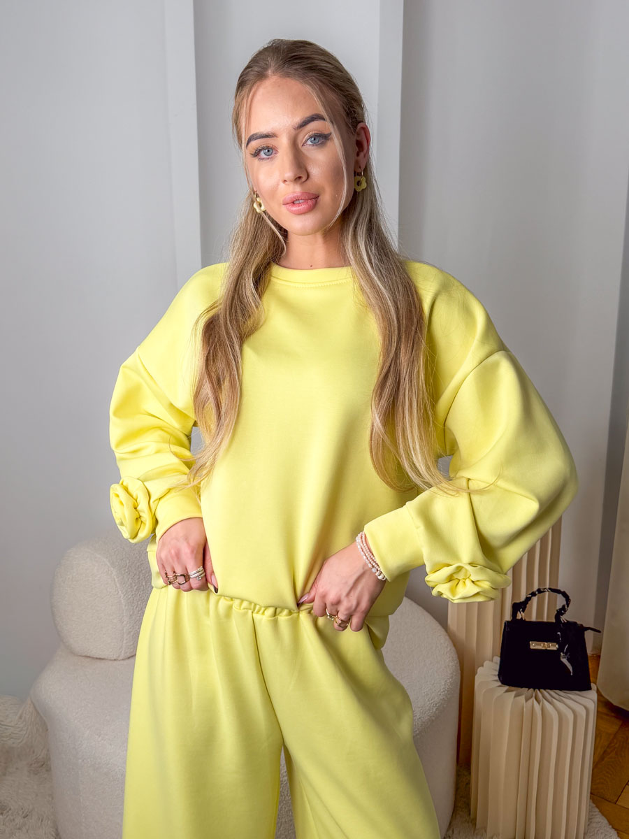 Komplet masełkowy: bluza z różą + rozkloszowane spodnie Bananowy – Rosabelle Set