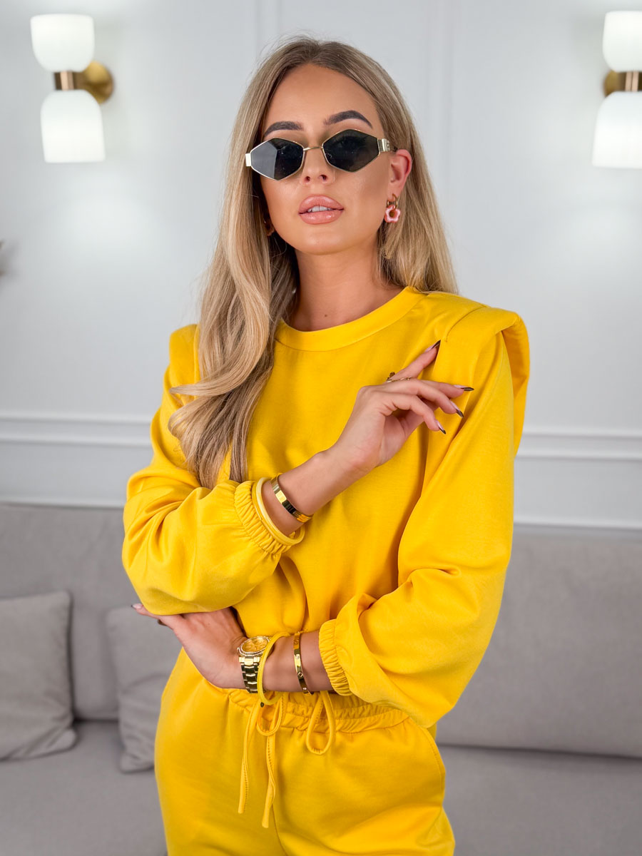 Komplet dresowy damski Żółty – Lazy Tie to energetyczna propozycja, która łączy wygodę z modnym, przyciągającym wzrok kolorem. Wykonany z miękkiego, przyjemnego w dotyku materiału, zapewnia wysoki komfort noszenia i swobodę ruchów przez cały dzień. Bluza o luźnym kroju doskonale układa się na sylwetce, a spodnie wykończone ściągaczami przy nogawkach nadają całości nowoczesny, casualowy charakter. Regulowane wiązanie w pasie pozwala na idealne dopasowanie do figury. Intensywny żółty odcień dodaje stylizacji świeżości i pozytywnej energii, sprawiając, że komplet świetnie sprawdzi się zarówno na co dzień, jak i podczas relaksu.