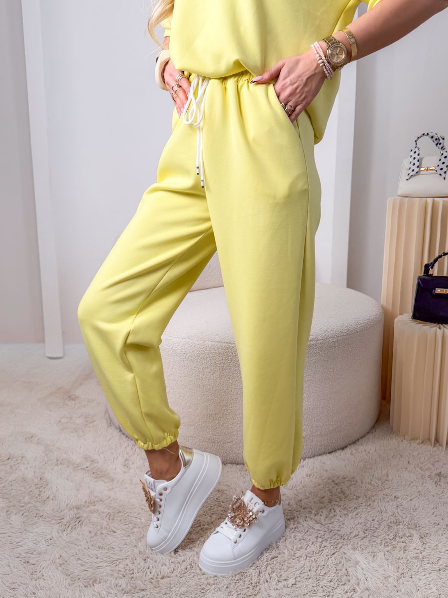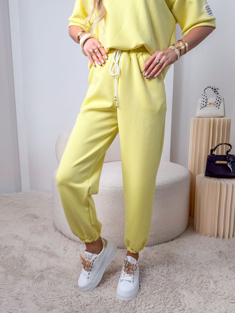 Komplet masełkowy: bluzka z naszywką + spodnie ze ściagaczami Bananowy – Velmira Lounge