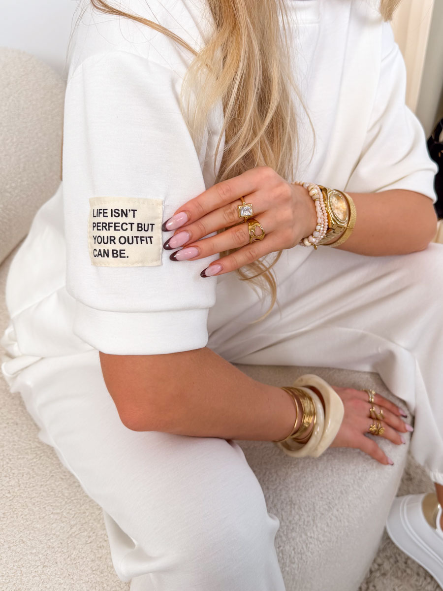 Komplet masełkowy: bluzka z naszywką + spodnie ze ściagaczami Biały – Velmira Lounge