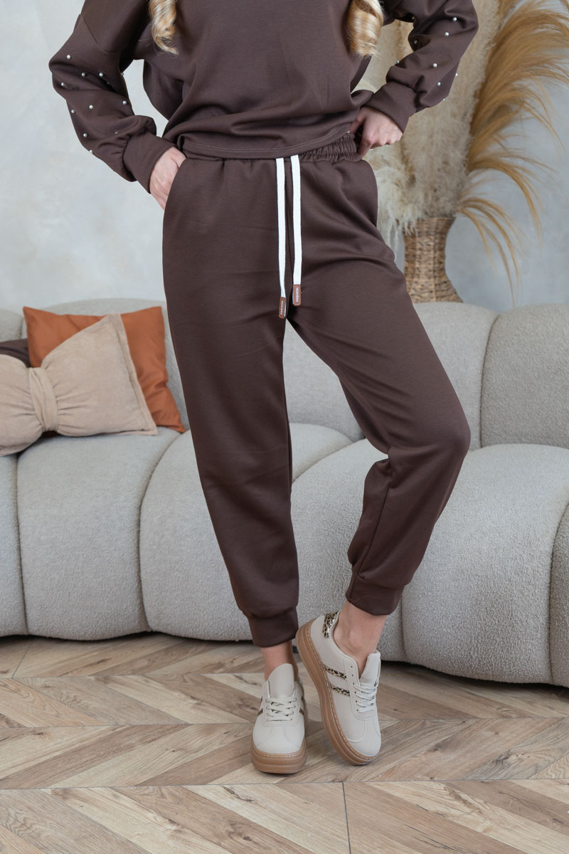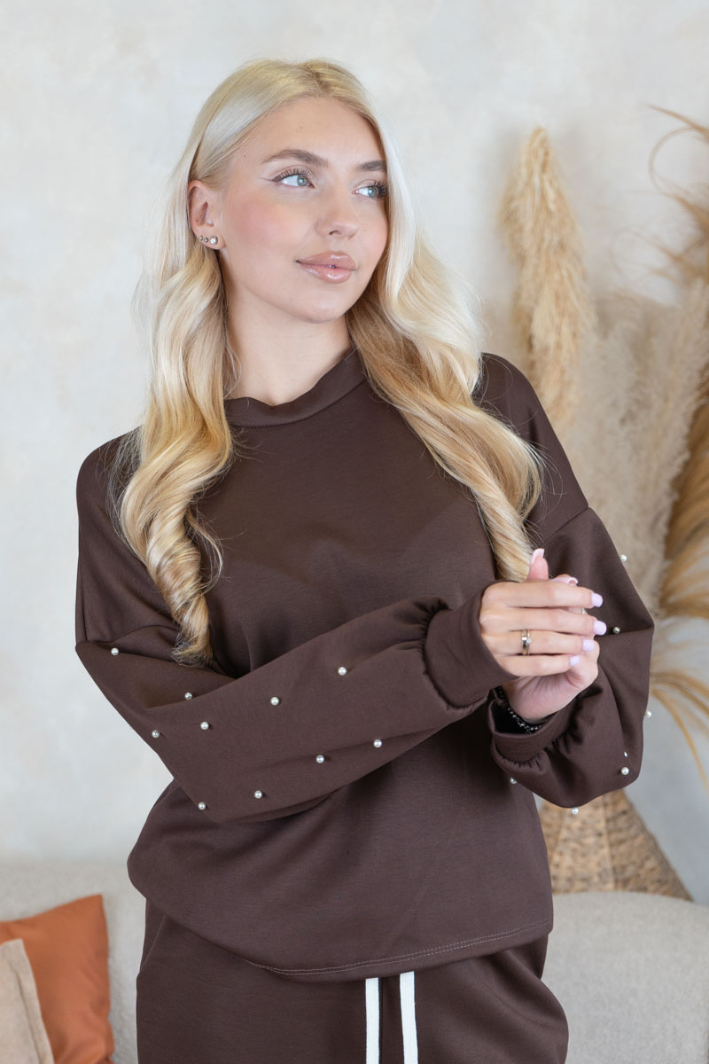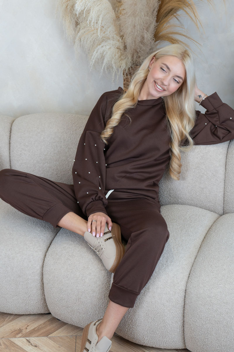 Komplet z bluzą zdobioną perełkami i spodniami Czekoladowy – Pearlyss