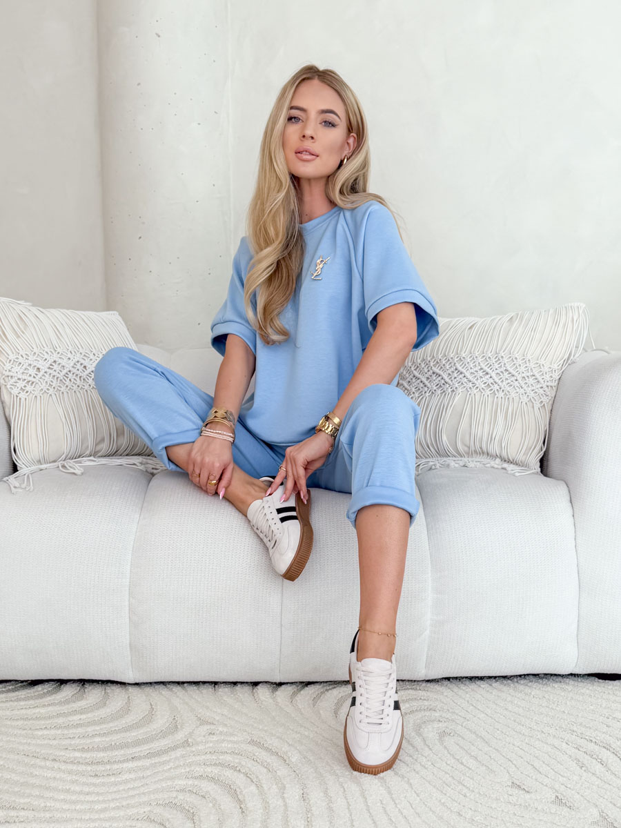 Komplet Viscoria Set w błękitnym odcieniu to idealne połączenie komfortu i świeżego, nowoczesnego stylu. Wykonany z lekkiej, oddychającej wiskozy, zapewnia wygodę noszenia przez cały dzień. Luźna bluzka o prostym kroju została ozdobiona subtelną broszką, która dodaje całości eleganckiego akcentu. Spodnie z podwiniętymi nogawkami oraz elastyczną talią gwarantują swobodę ruchów i doskonałe dopasowanie do sylwetki. Delikatny, pastelowy kolor wprowadza lekkość do stylizacji, czyniąc komplet świetnym wyborem zarówno na co dzień, jak i do bardziej dopracowanych zestawów.