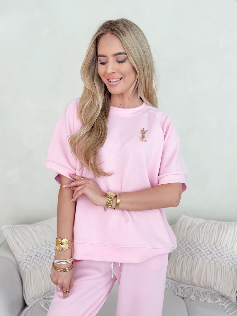Komplet z wiskozy: podwinięte spodnie i bluzka z broszką Pudrowy – Viscoria Set