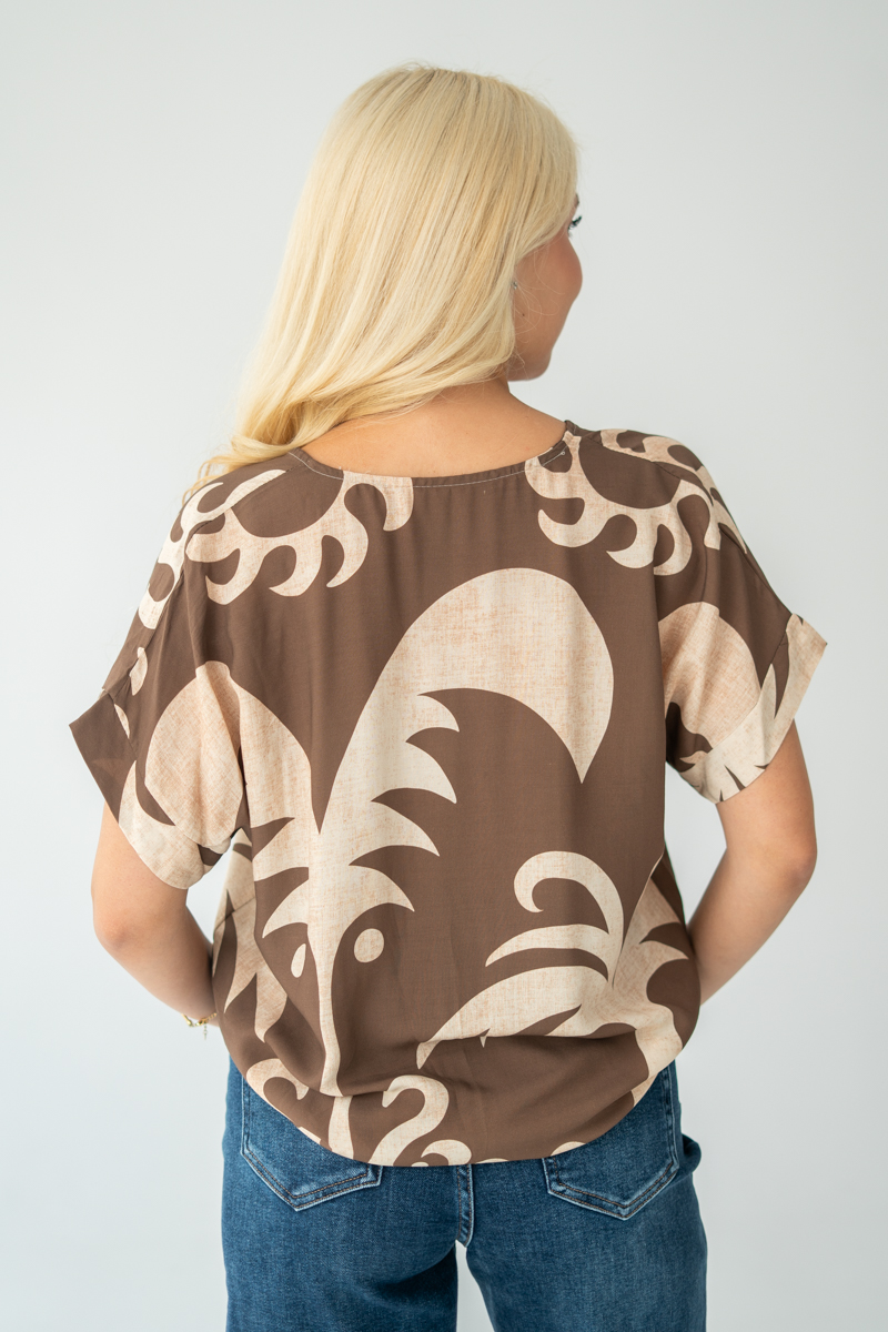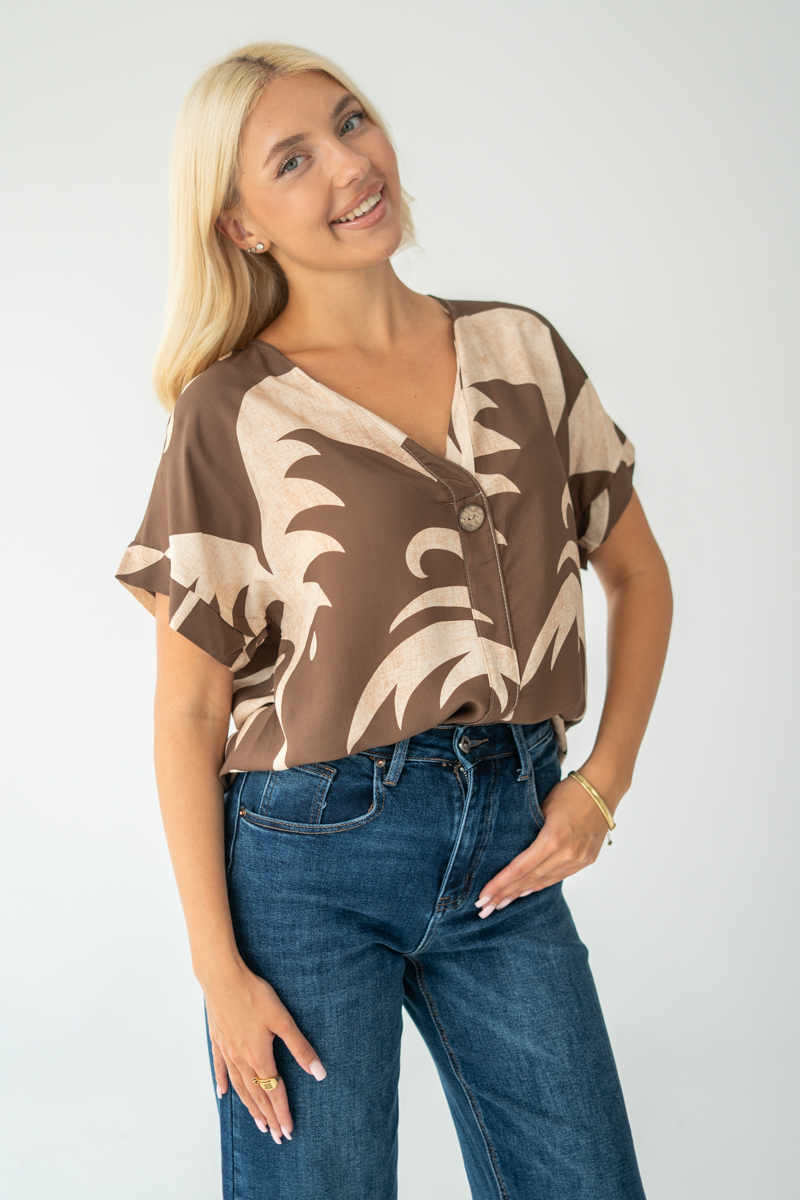 Damska koszula oversize z nadrukiem tropikalnym Czekoladowy – Patternelle