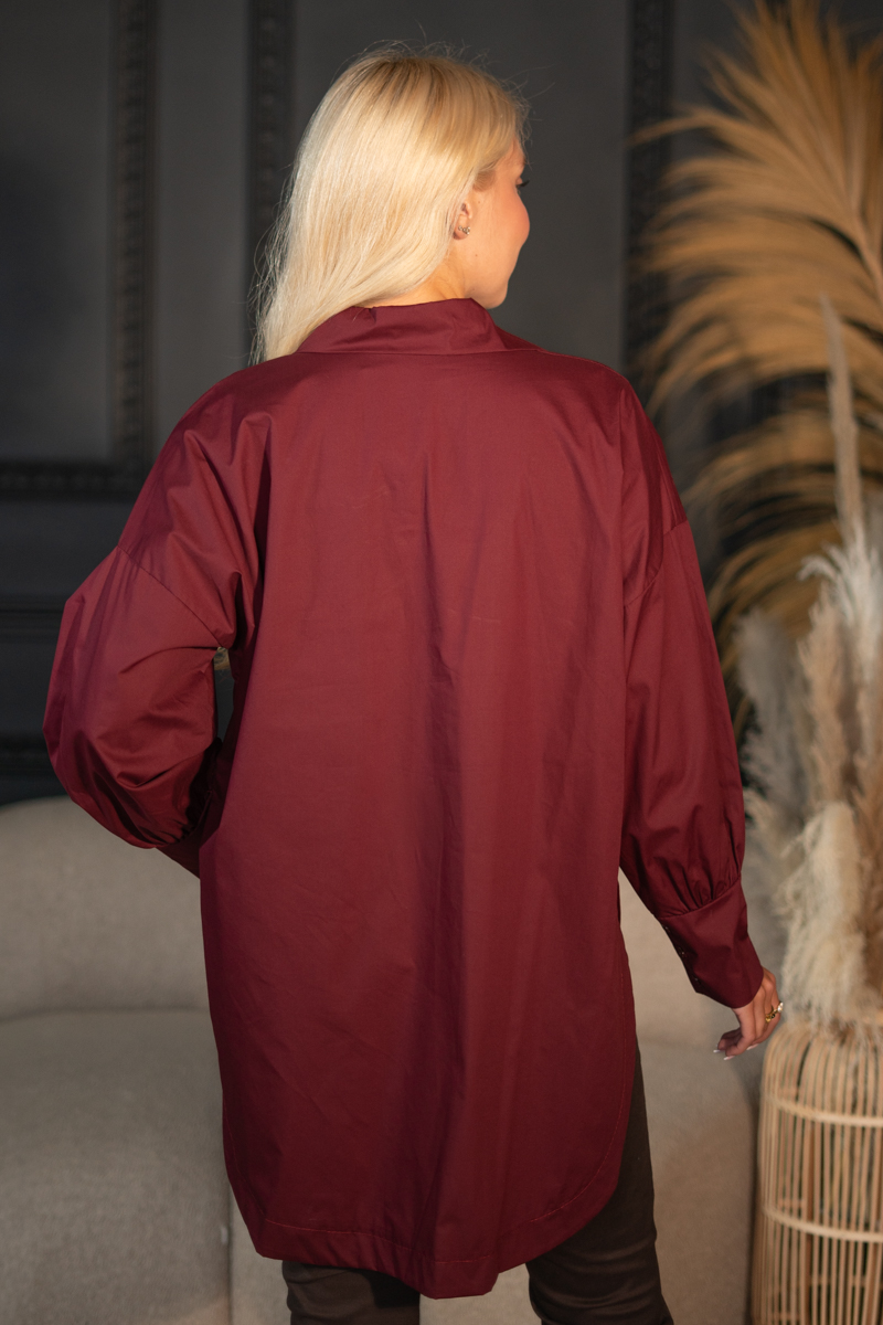 Długa koszula damska oversize Jonirae w kolorze bordowym to stylowa propozycja dla kobiet ceniących wygodę i elegancję w jednym. Luźny fason świetnie układa się na sylwetce, zapewniając swobodę ruchów i nowoczesny, lekko formalny charakter. Dłuższy tył oraz klasyczny kołnierzyk dodają koszuli ponadczasowego stylu, który sprawdza się zarówno w codziennych, jak i bardziej wyjściowych zestawach. Głęboki bordowy odcień podkreśla wyjątkowy charakter modelu, tworząc efektowną bazę do wielu modnych stylizacji.