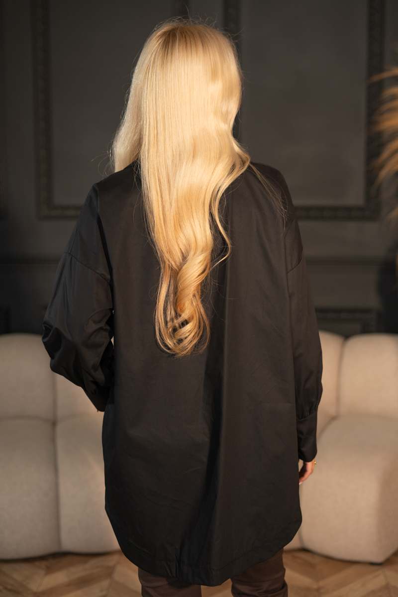 Długa koszula damska oversize Jonirae w kolorze czarnym to uniwersalna propozycja, która łączy wygodę z elegancją. Luźny krój zapewnia swobodę ruchów i doskonale układa się na sylwetce, tworząc nowoczesny, lekko nonszalancki look. Klasyczny kołnierzyk i dłuższy tył nadają jej stylowego charakteru, idealnego zarówno do codziennych stylizacji, jak i bardziej formalnych zestawów. Wykonana z przyjemnego w dotyku materiału, świetnie sprawdzi się w połączeniu z dopasowanymi spodniami czy legginsami, tworząc modny, ponadczasowy outfit.