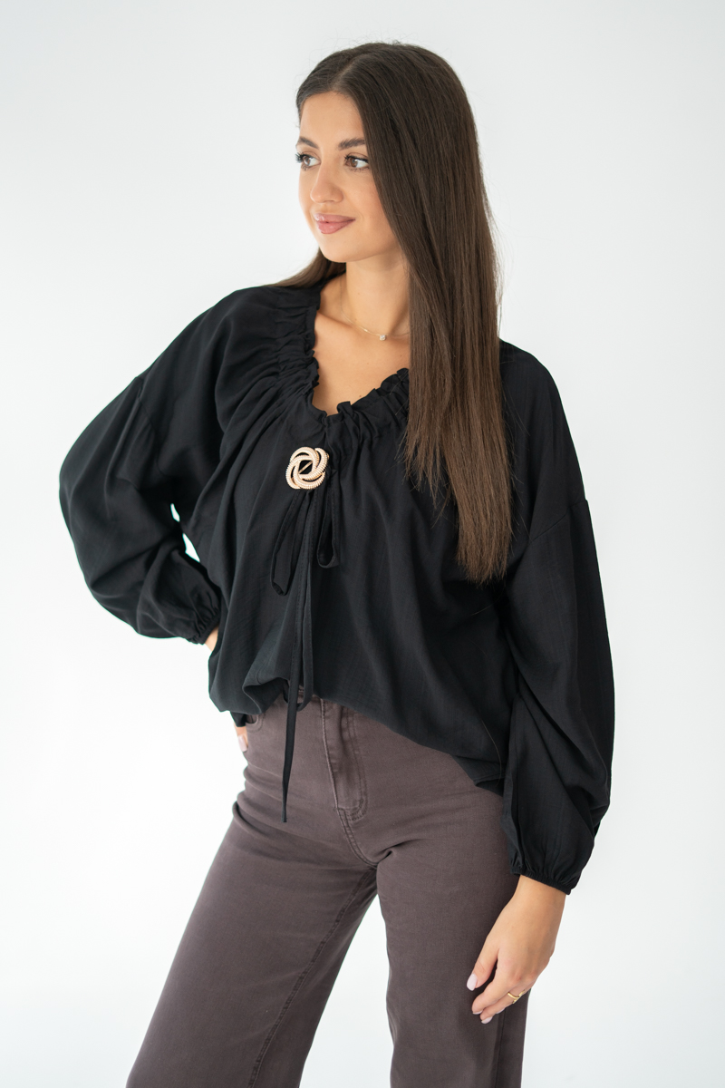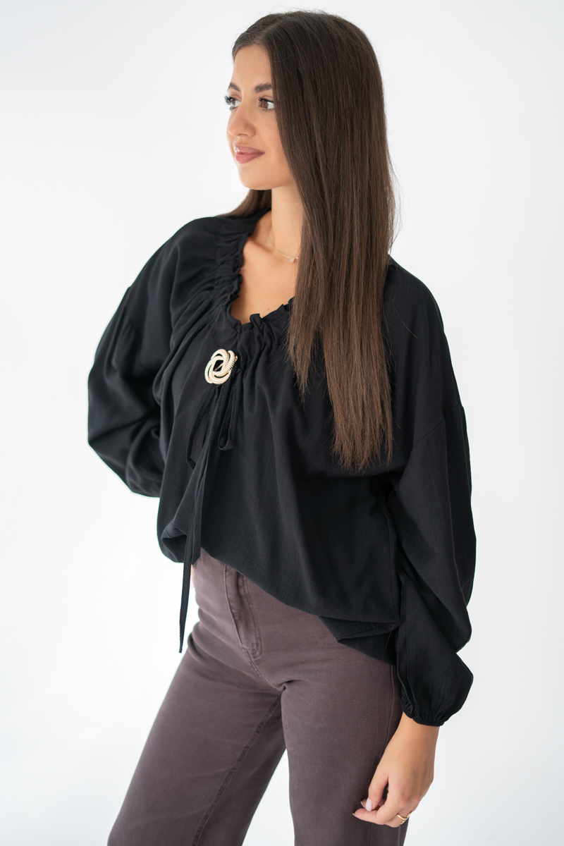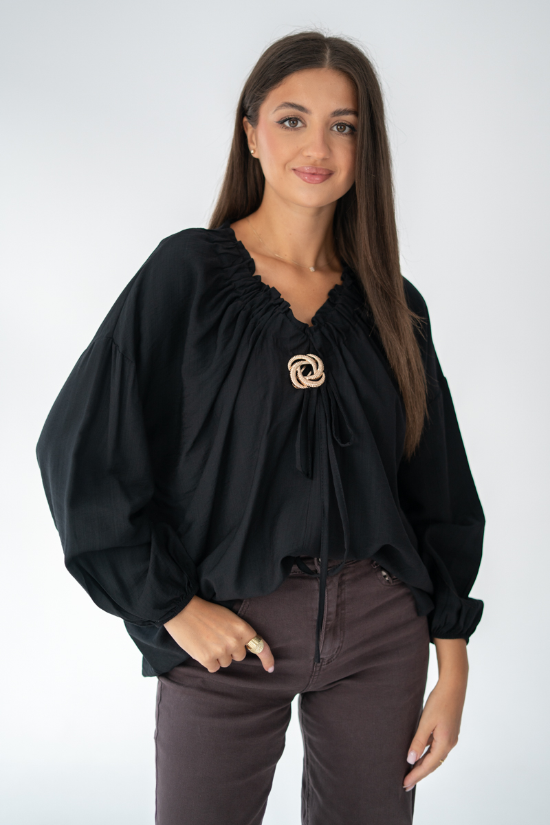 Koszula z marszczonym dekoltem i broszką Czarny – Aurivane