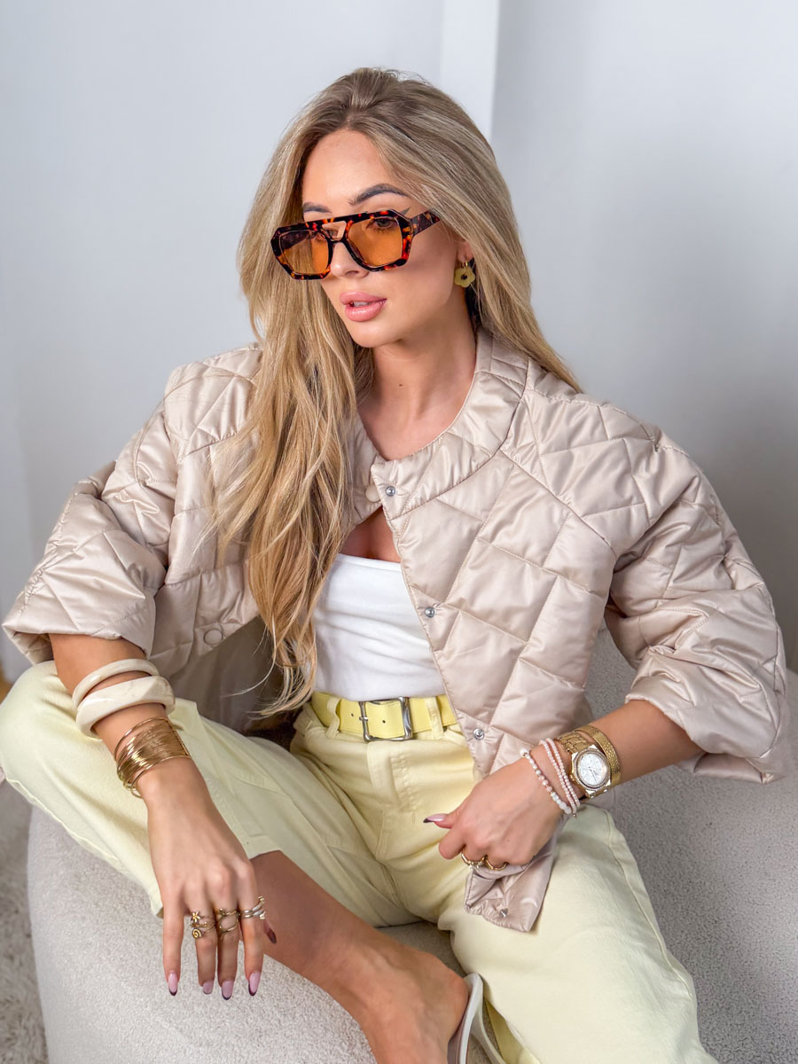 Kurtka zapinana na napy Beżowy to ponadczasowa propozycja, która łączy minimalistyczny styl z codzienną wygodą. Pikowany fason o luźniejszym kroju pięknie układa się na sylwetce, a subtelny beżowy odcień doskonale wpisuje się w estetykę naturalnej elegancji. Model zapinany na napy zapewnia komfort noszenia i pozwala regulować stopień zapięcia w zależności od stylizacji, a delikatnie zaokrąglony dekolt nadaje całości lekkości. Kurtka świetnie sprawdzi się w przejściowych sezonach – w połączeniu z jeansami, jasnymi spodniami czy sukienką tworzy spójny, stylowy look na co dzień i na bardziej eleganckie wyjścia.