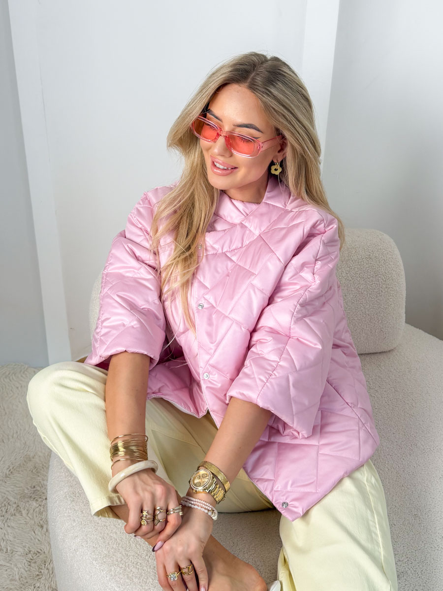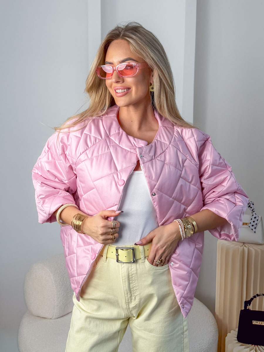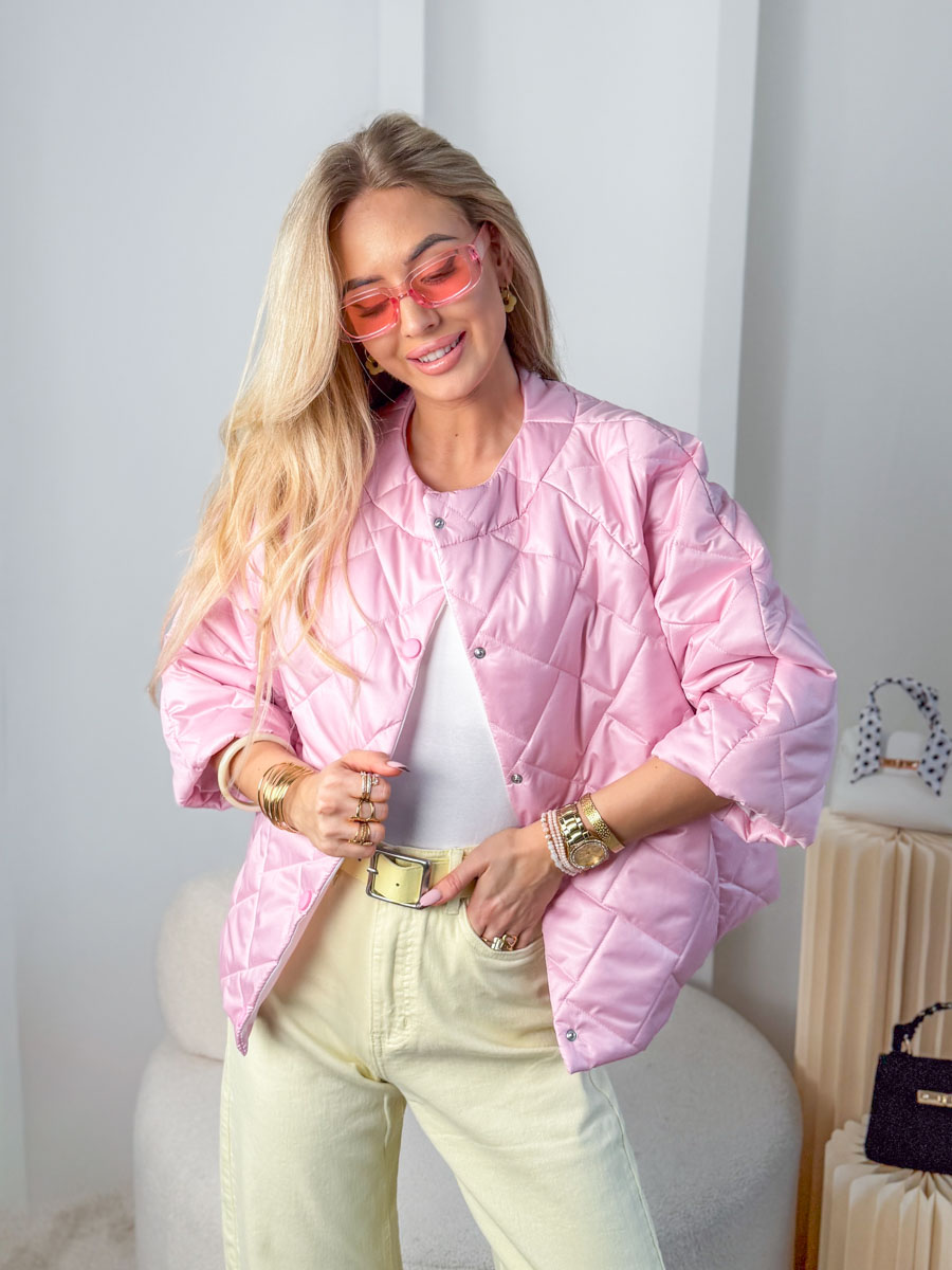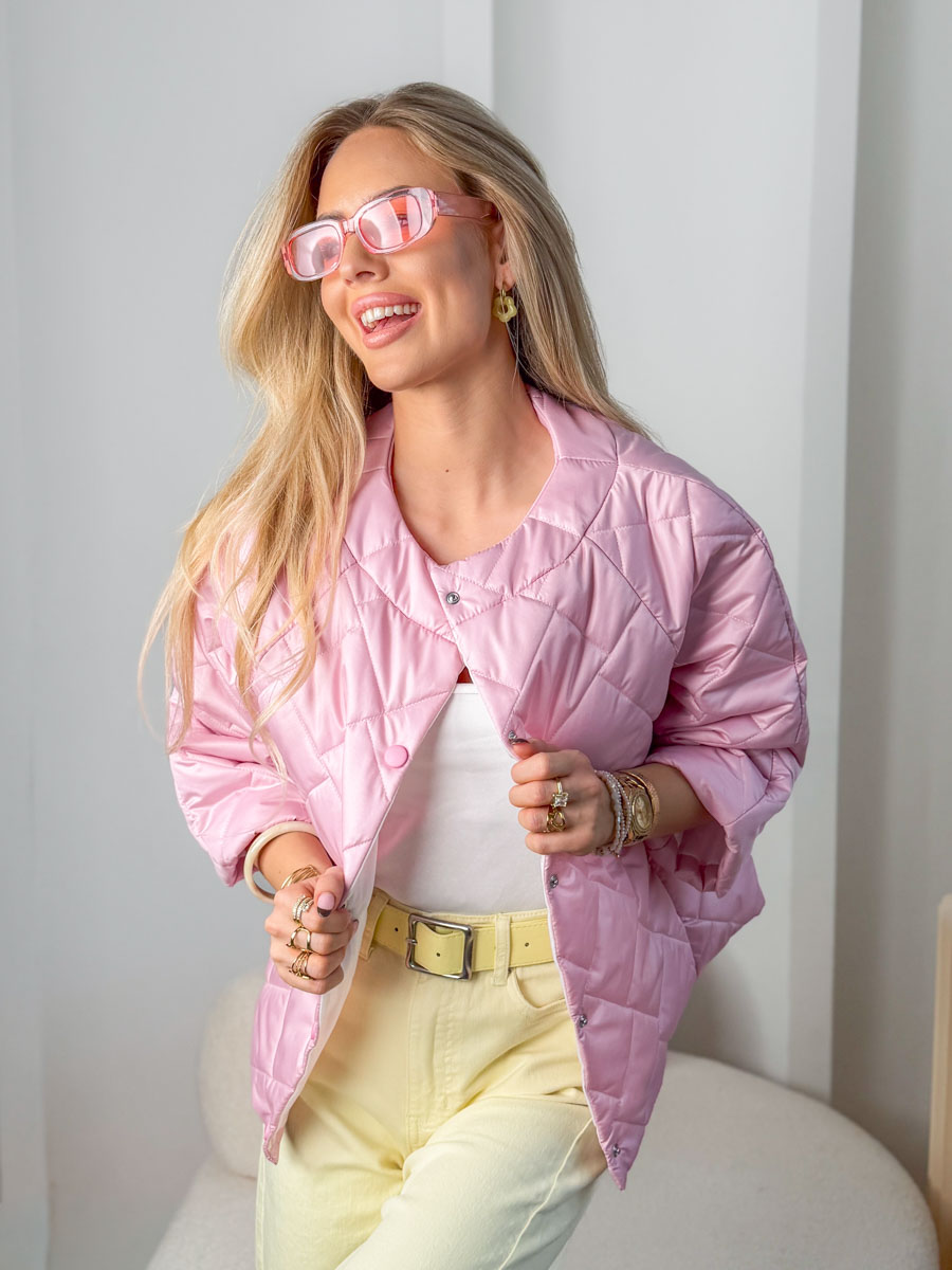 Kurtka zapinana na napy Pudrowy – Snapora to stylowa i kobieca propozycja na sezon przejściowy, która łączy w sobie lekkość, komfort i modny design. Model wykonany został z przyjemnego w dotyku materiału z pikowaniem w geometryczny wzór, co nadaje mu nowoczesnego charakteru, a jednocześnie zapewnia delikatne ocieplenie. Zapinana na praktyczne napy, z subtelną stójką i swobodnym fasonem, pięknie układa się na sylwetce i pozwala na tworzenie wielu stylizacji – od casualowych z jeansami po bardziej eleganckie zestawy z materiałowymi spodniami czy sukienką. Pudrowy odcień dodaje całości świeżości i romantycznego uroku, czyniąc tę kurtkę idealnym wyborem na wiosenne i letnie dni.