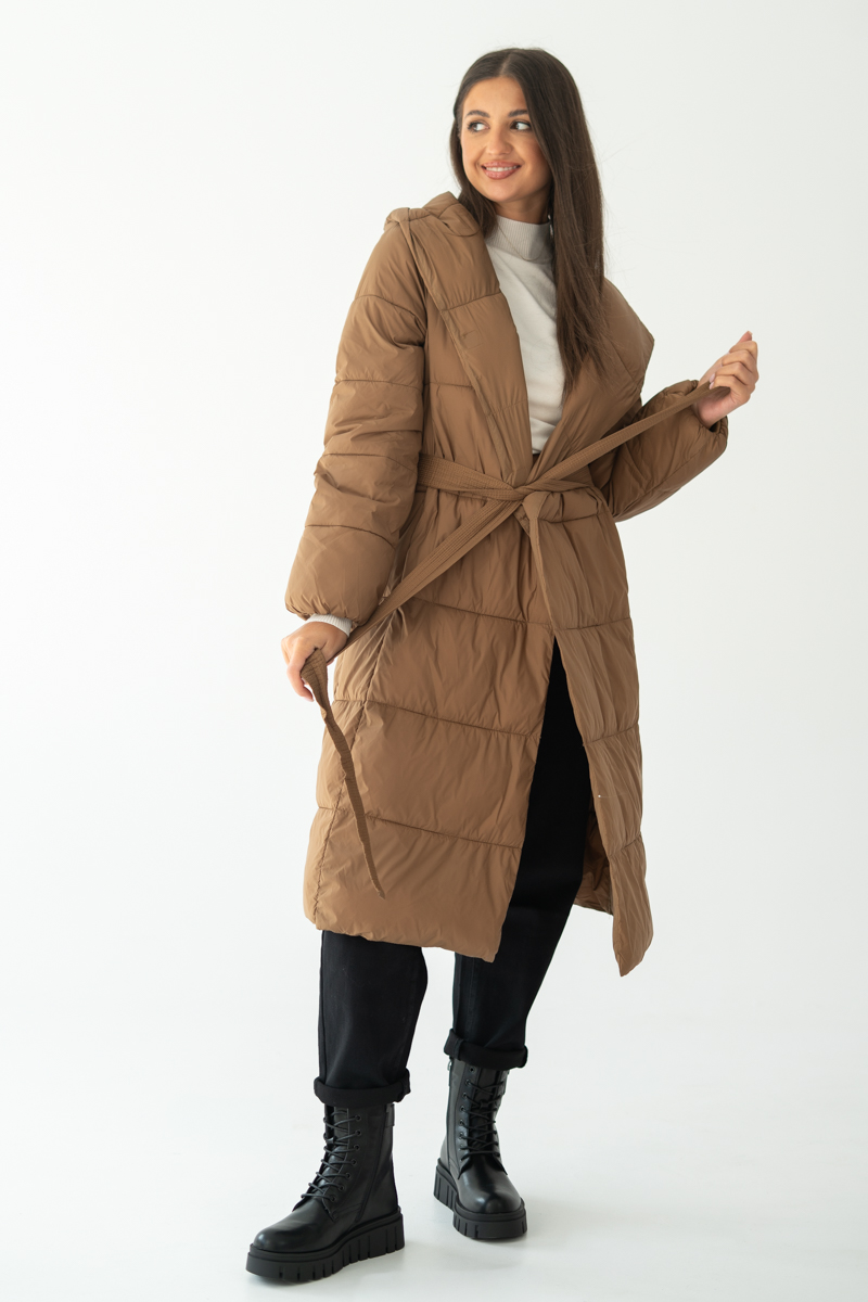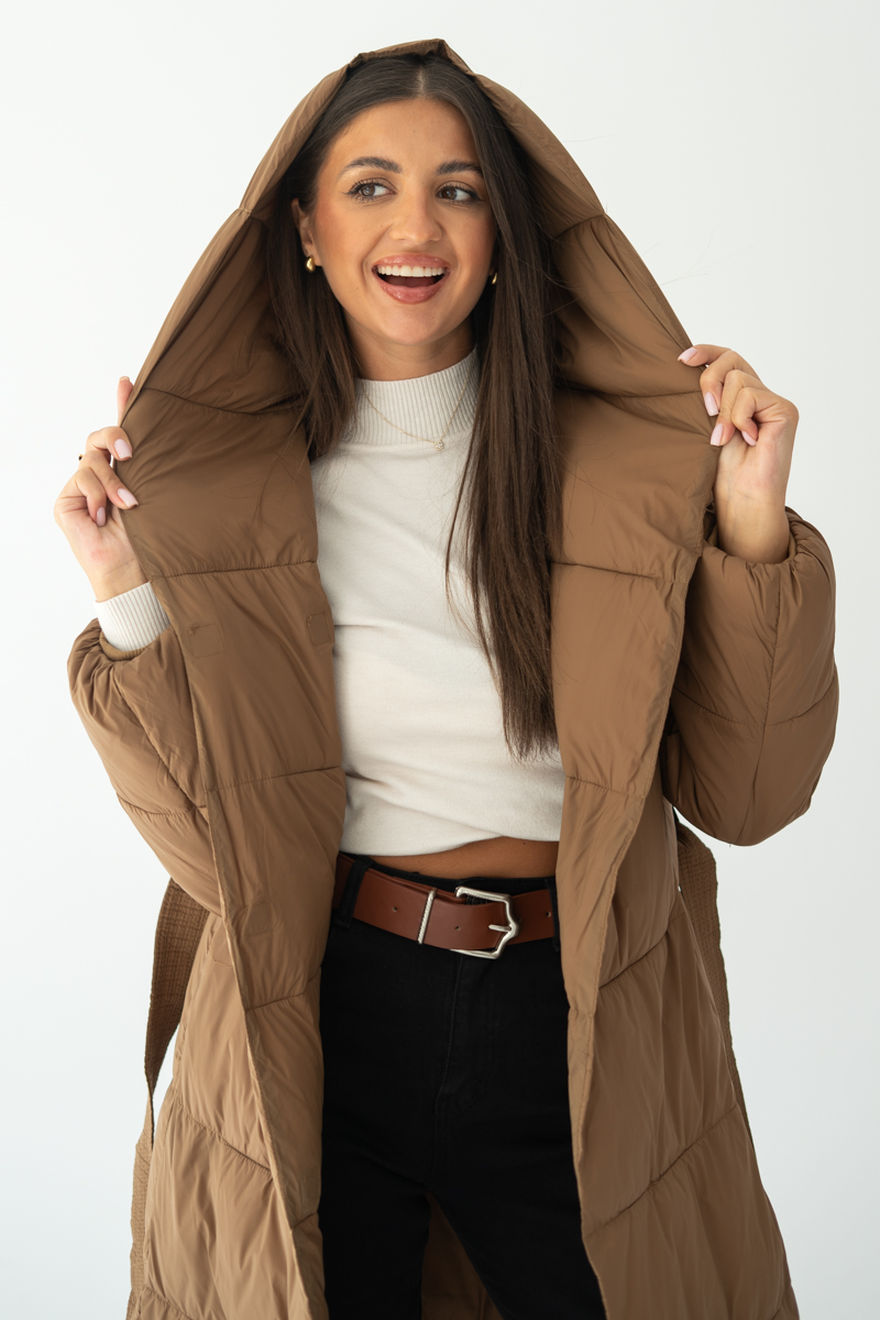 Długi płaszcz puchowy z kapturem Piaskowy – Calvoria