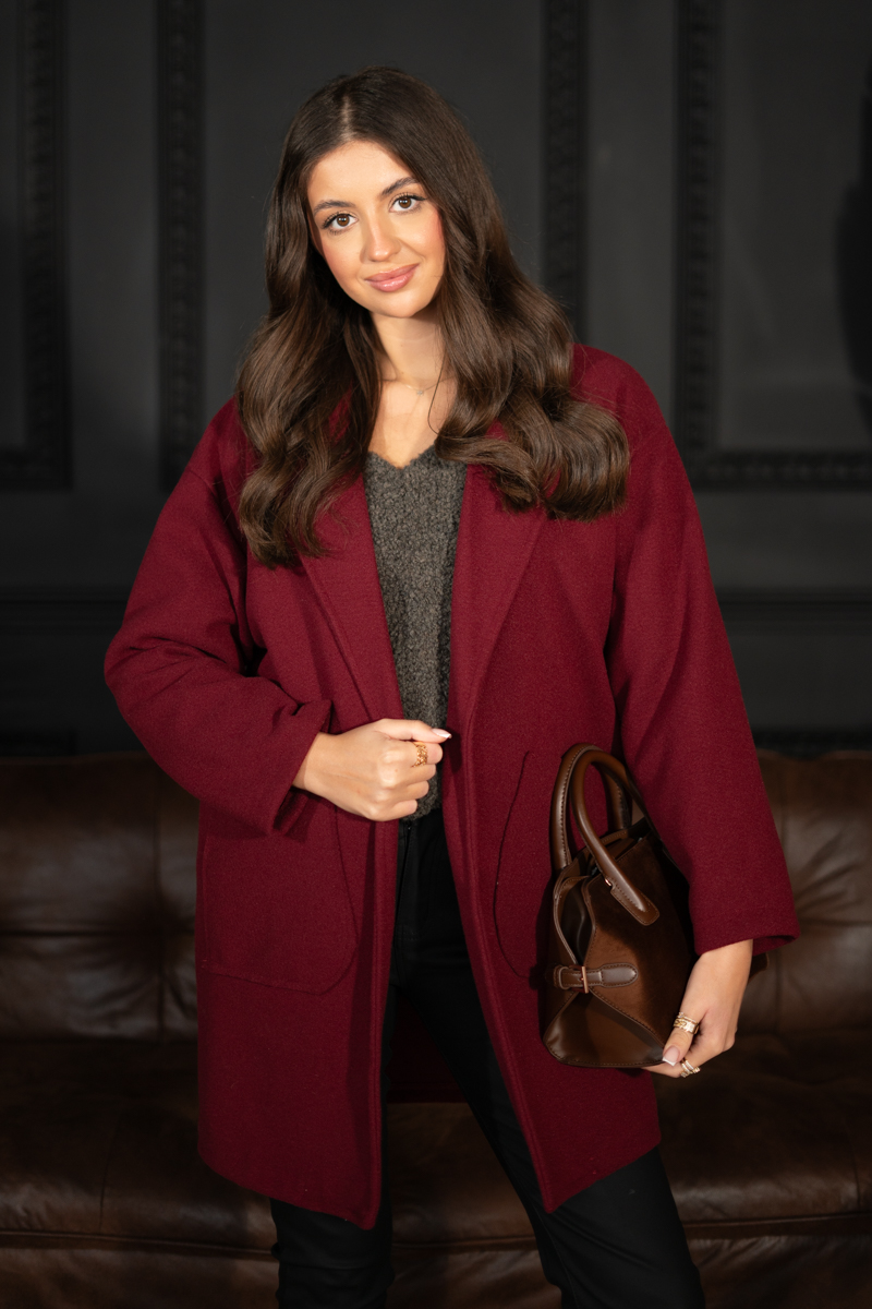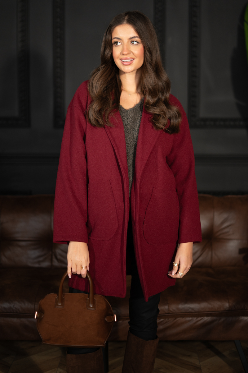 Płaszcz Calenya w głębokim bordowym kolorze to stylowa propozycja, która łączy elegancję z wygodą. Wykonany z miękkiego, przyjemnego materiału, doskonale sprawdzi się w chłodniejsze dni, zapewniając komfort noszenia. Klasyczny kołnierz i pojedyncze zapięcie na złoty guzik nadają całości szykownego charakteru, a luźniejszy fason gwarantuje swobodę ruchów. Duże, praktyczne kieszenie podkreślają jego funkcjonalność i codzienny urok. Bordowy odcień dodaje stylizacjom wyrazistości, sprawiając, że płaszcz świetnie komponuje się zarówno z eleganckimi sukienkami, jak i bardziej casualowymi zestawami. Idealny wybór na sezon jesienno-zimowy.