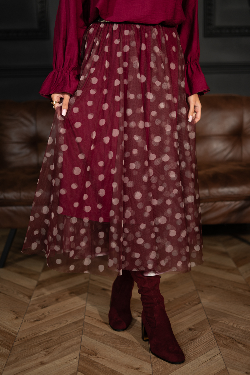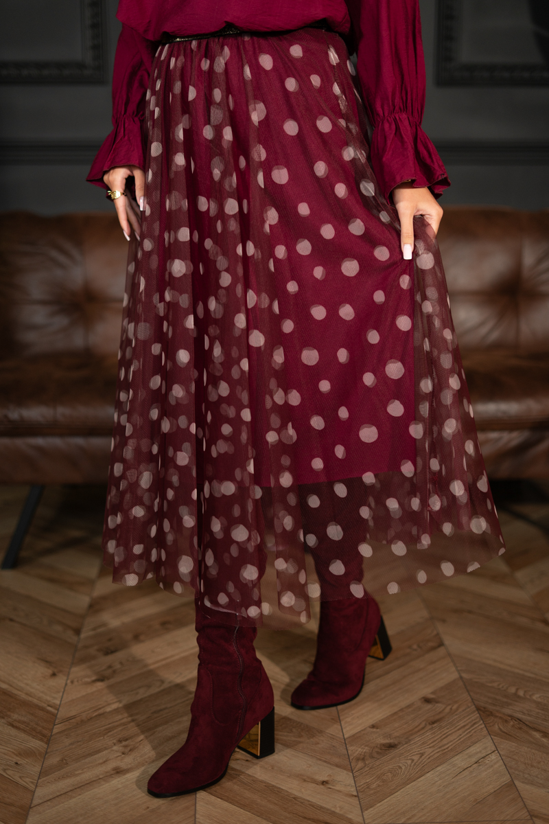 Spódnica tiulowa Zolivra w bordowym kolorze to romantyczna i zarazem nowoczesna propozycja dla kobiet ceniących lekkość i styl. Wykonana z delikatnego, półprzezroczystego tiulu z modnym wzorem w kropki, nadaje stylizacji subtelnej dziewczęcości. Elastyczna złota gumka w pasie nie tylko zapewnia wygodę noszenia, ale także stanowi efektowny akcent, który pięknie kontrastuje z głębokim kolorem spódnicy. Zwiewny fason dodaje lekkości sylwetce i sprawia, że spódnica doskonale układa się w ruchu. Idealna na co dzień w połączeniu z prostym topem, jak i na bardziej eleganckie okazje zestawiona z koszulą czy marynarką.