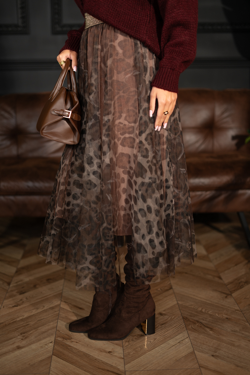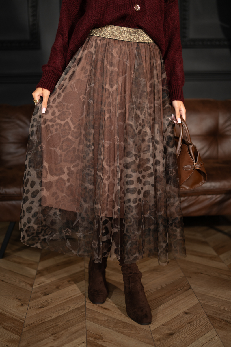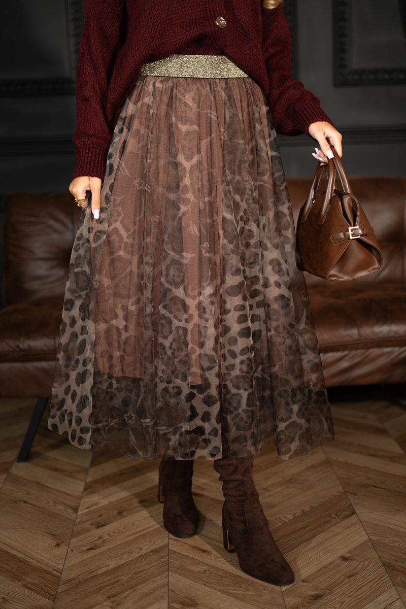Spódnica tiulowa Zolivra w modny wzór panterki to stylowa propozycja dla kobiet, które lubią łączyć odważny design z subtelną elegancją. Wykonana z lekkiego, zwiewnego tiulu, prezentuje się niezwykle efektownie i dodaje stylizacji lekkości. Elastyczna złota gumka w pasie gwarantuje wygodne dopasowanie oraz stanowi ozdobny akcent, podkreślający talię. Zwiewny fason pięknie układa się w ruchu, tworząc kobiecy i modny look. Spódnica świetnie sprawdzi się zarówno w codziennych zestawach z prostym topem i ramoneską, jak i w bardziej eleganckich stylizacjach na wyjątkowe okazje.