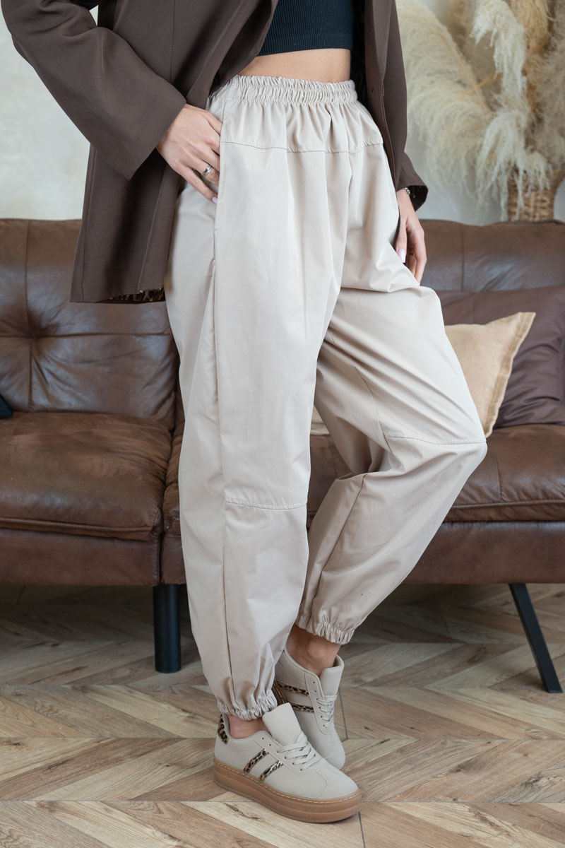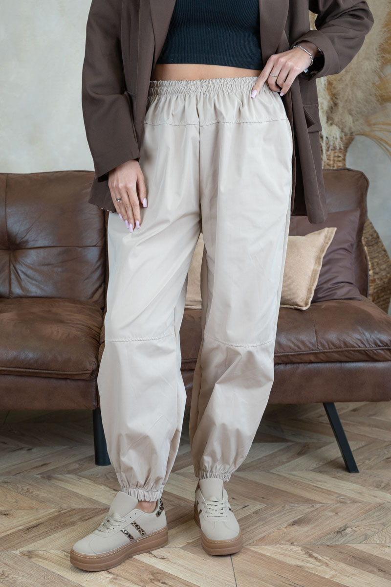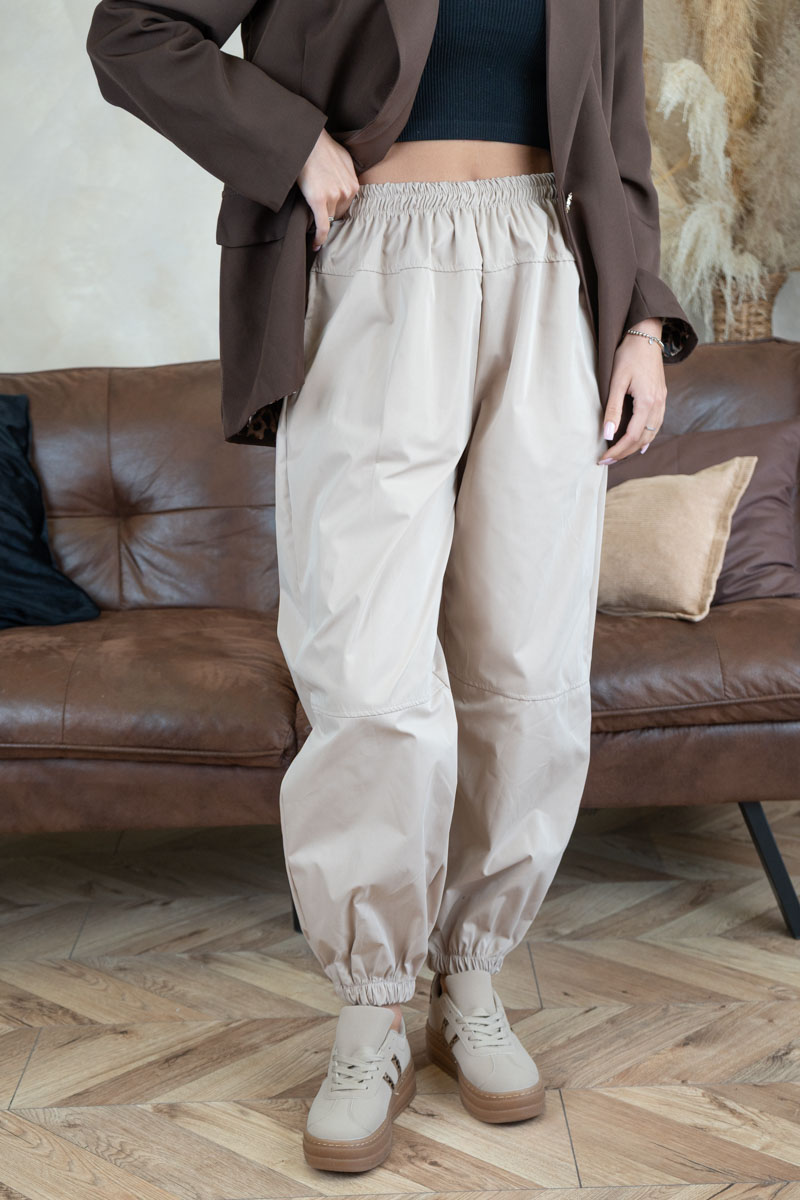 Spodnie materiałowe szerokie ze ściągaczami Beżowy – Flowenne to modna i wygodna propozycja do codziennych stylizacji. Uszyte z lekkiego, przewiewnego materiału, gwarantują komfort noszenia i pełną swobodę ruchów. Szeroki fason nadaje im nowoczesnego charakteru, a elastyczne ściągacze w pasie zapewniają idealne dopasowanie. Neutralny beżowy kolor sprawia, że spodnie świetnie komponują się zarówno z casualowymi bluzami, jak i bardziej eleganckimi elementami garderoby, tworząc uniwersalną bazę wielu stylizacji.