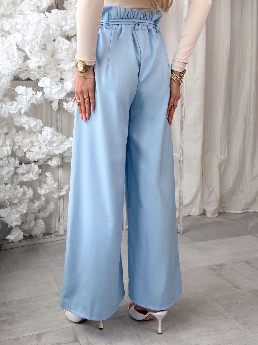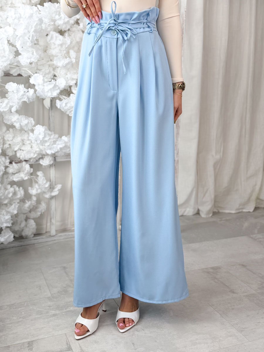 Spodnie materiałowe eleganckie z zakładkami i paskiem Błękitne – Pleatessa to stylowa i ponadczasowa propozycja, która doskonale łączy elegancję z wygodą. Wykonane z lekkiego, lejącego materiału, pięknie układają się na sylwetce, a zakładki z przodu dodają im klasy i subtelnie modelują figurę. Wysoki stan z paskiem i wiązaniem podkreśla talię, zapewniając jednocześnie idealne dopasowanie. Delikatny błękitny kolor nadaje całości świeżości i lekkości, dzięki czemu spodnie świetnie sprawdzą się zarówno w eleganckich stylizacjach do pracy, jak i w bardziej casualowych zestawach na co dzień.