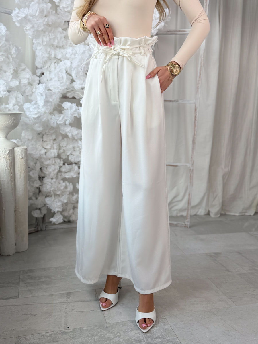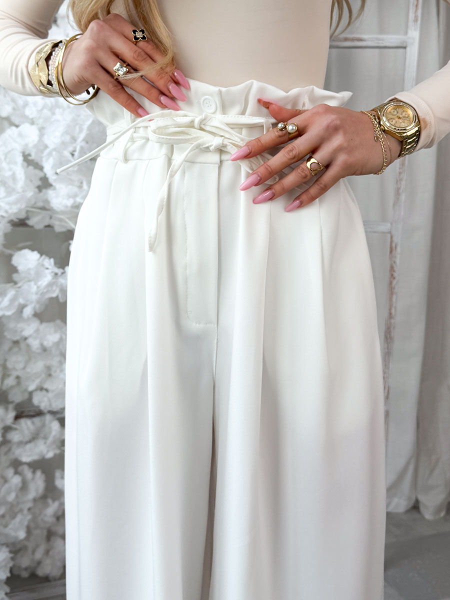 Spodnie materiałowe eleganckie z zakładkami i paskiem Śmietankowe – Pleatessa to klasyczna i niezwykle stylowa propozycja, która doskonale wpisuje się w elegancki, a jednocześnie nowoczesny styl. Wykonane z lekkiego, lejącego materiału, pięknie układają się na sylwetce, zapewniając komfort noszenia przez cały dzień. Zakładki z przodu dodają im szyku i subtelnie modelują figurę, natomiast wysoki stan z paskiem i wiązaniem podkreśla talię i pozwala na idealne dopasowanie. Śmietankowy odcień nadaje całości świeżości i ponadczasowej elegancji, dzięki czemu spodnie świetnie sprawdzą się zarówno w stylizacjach biurowych, jak i na bardziej formalne lub codzienne wyjścia.