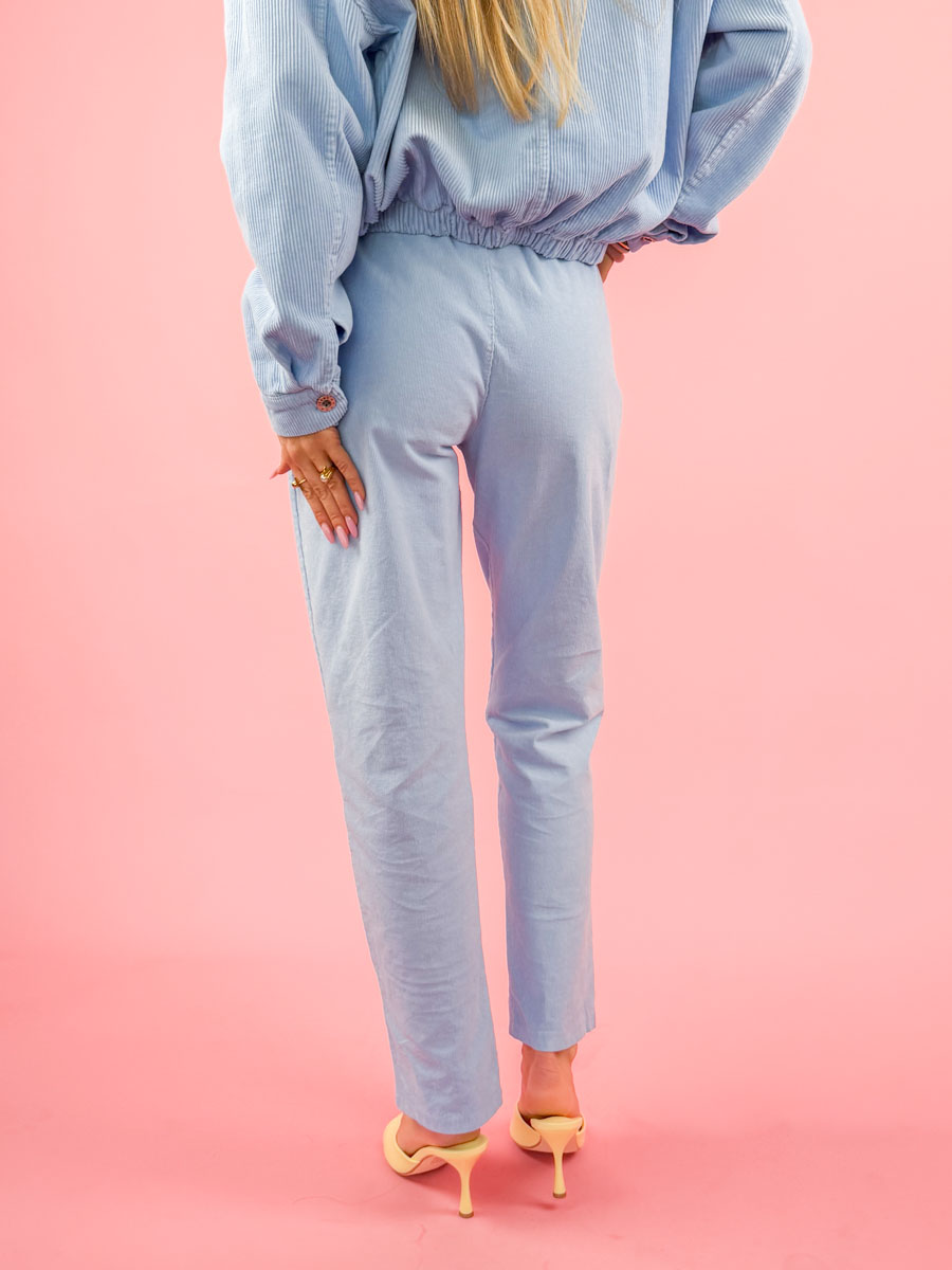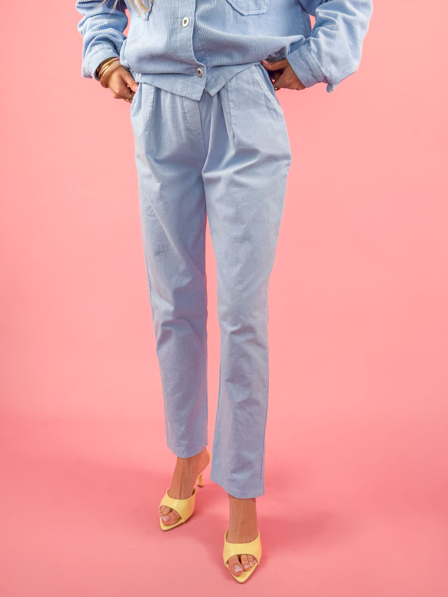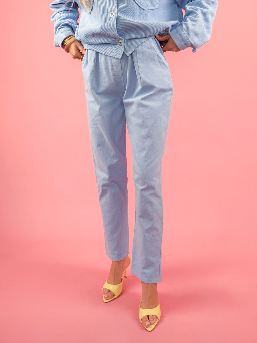 Spodnie sztruksowe Cordelia Pantsw błękitnym kolorze to stylowa i wygodna propozycja do codziennych stylizacji. Wykonane z miękkiego, przyjemnego w dotyku sztruksu o wyraźnej strukturze, zapewniają komfort noszenia i modny wygląd. Model o luźniejszym kroju z delikatnie zwężanymi nogawkami pięknie układa się na sylwetce i gwarantuje swobodę ruchów. Elastyczna talia oraz praktyczne kieszenie zwiększają funkcjonalność spodni, a podwinięte nogawki dodają całości casualowego charakteru. Świetnie komponują się zarówno z koszulą, swetrem, jak i kurtką z tej samej kolekcji, tworząc spójny i stylowy zestaw. Idealne na co dzień – do pracy, na spotkania czy spacer.