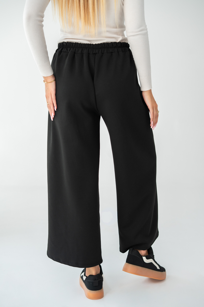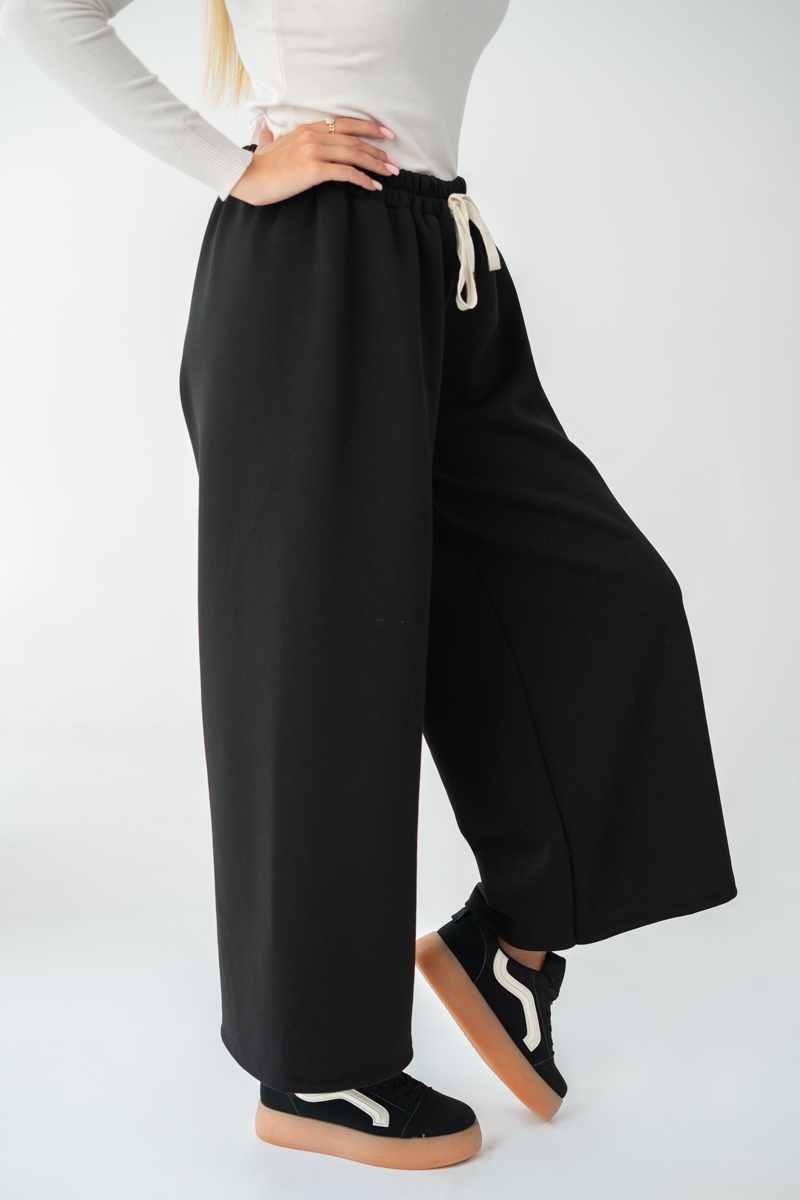 Spodnie z szeroką nogawką i wiązaniem w pasie Czarny – Fashira