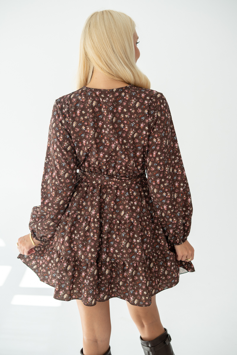 Sukienka kopertowa wiązana w kwiaty Czekoladowy – Rosynne