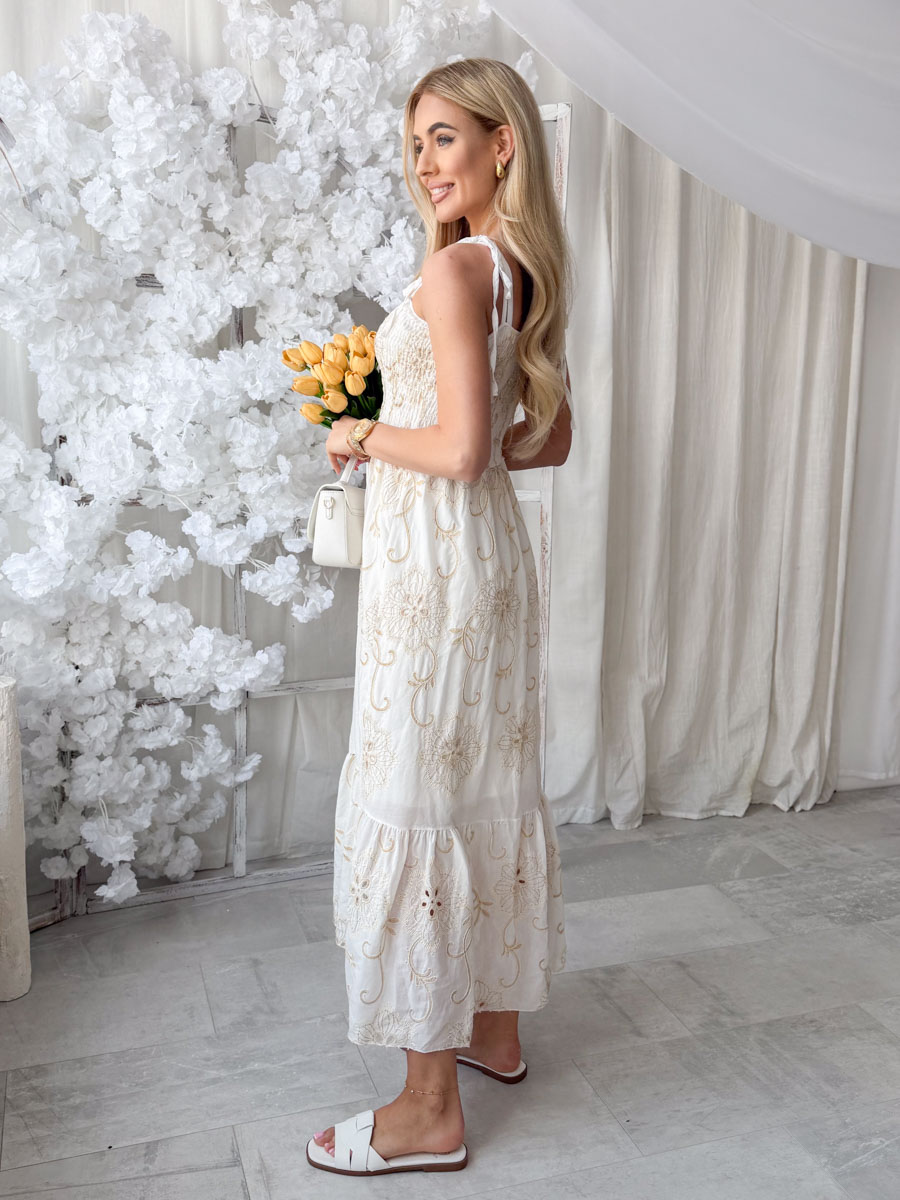 Sukienka maxi z haftem i górą bandeau Biała – Maxelle