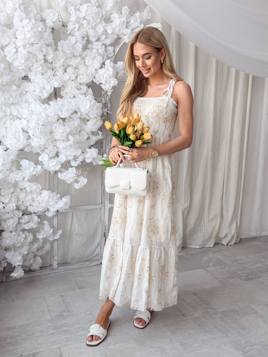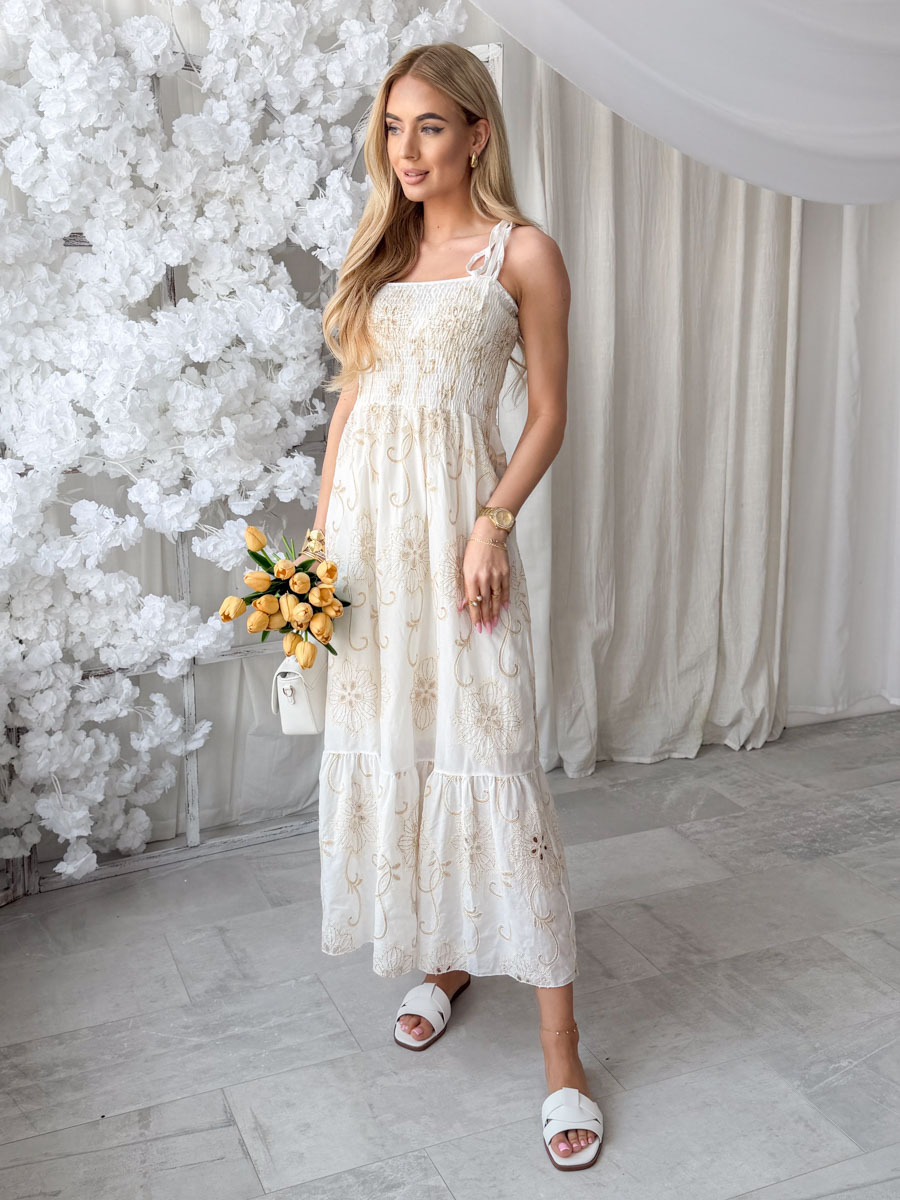 Sukienka maxi z haftem i górą bandeau Biała – Maxelle to efektowna i romantyczna propozycja, wykonana z lekkiego materiału ozdobionego bogatym, dekoracyjnym haftem, który przyciąga wzrok i nadaje całości eleganckiego charakteru; dopasowana góra typu bandeau pięknie podkreśla ramiona i dekolt, a cienkie ramiączka zapewniają komfort noszenia, natomiast rozkloszowany dół o długości maxi subtelnie układa się w ruchu, tworząc zwiewną i kobiecą sylwetkę, a klasyczna biel podkreśla świeżość i sprawia, że model doskonale sprawdzi się na wyjątkowe okazje, letnie przyjęcia czy wakacyjne stylizacje.