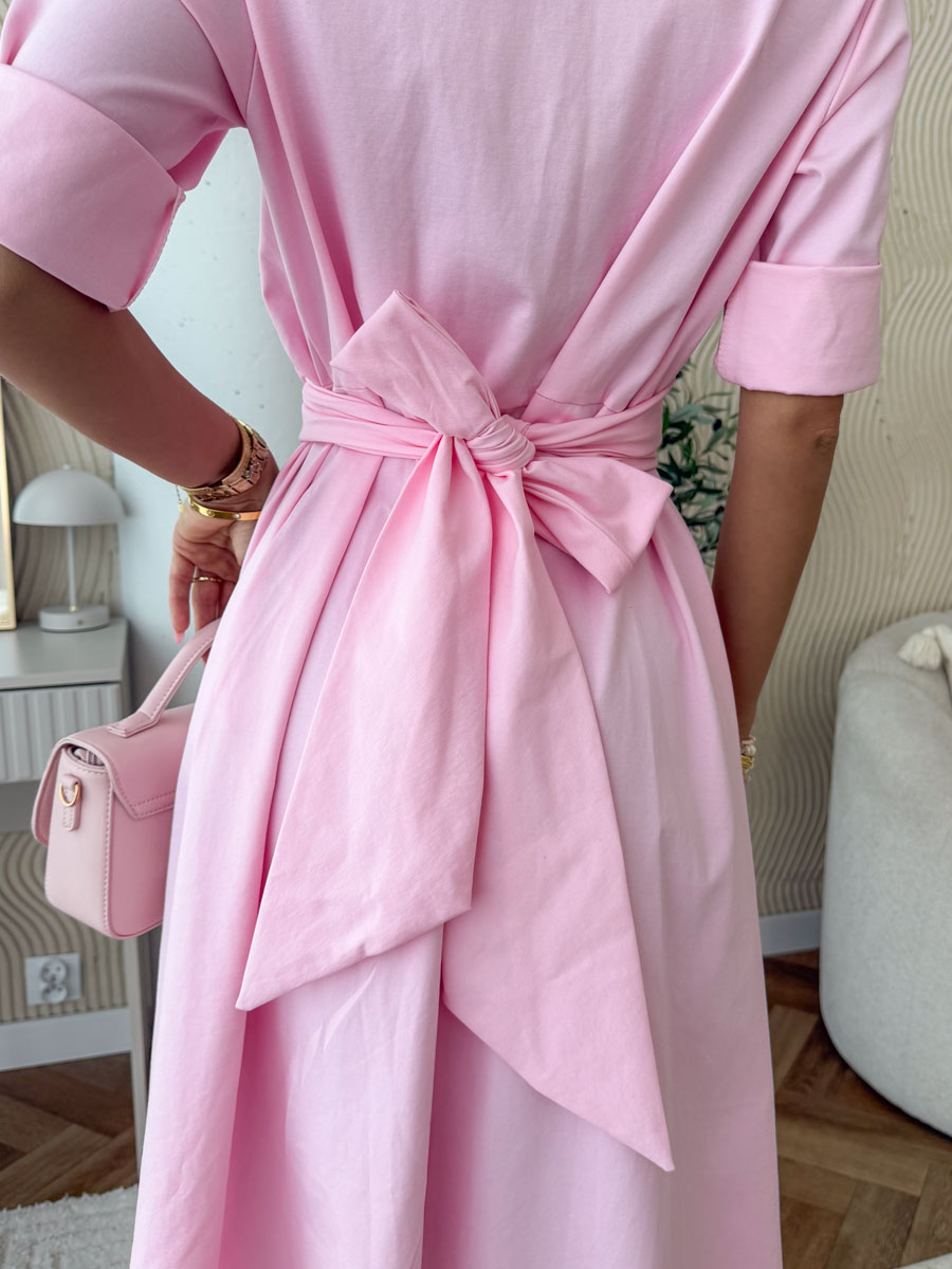 Sukienka koszulowa Collinea w różowym odcieniu to kobieca i stylowa propozycja na wiosnę oraz lato. Wykonana z lekkiego, przyjemnego w dotyku materiału, zapewnia komfort noszenia i swobodę ruchów przez cały dzień. Klasyczny kołnierzyk oraz dekolt w kształcie litery V nadają jej eleganckiego charakteru, a wiązany pasek w talii pięknie podkreśla sylwetkę. Krótki rękaw z podwinięciem dodaje lekkości i casualowego wyrazu. Różowy kolor wprowadza świeżość i subtelny urok do każdej stylizacji. To idealny wybór zarówno do pracy, jak i na codzienne czy weekendowe wyjścia.