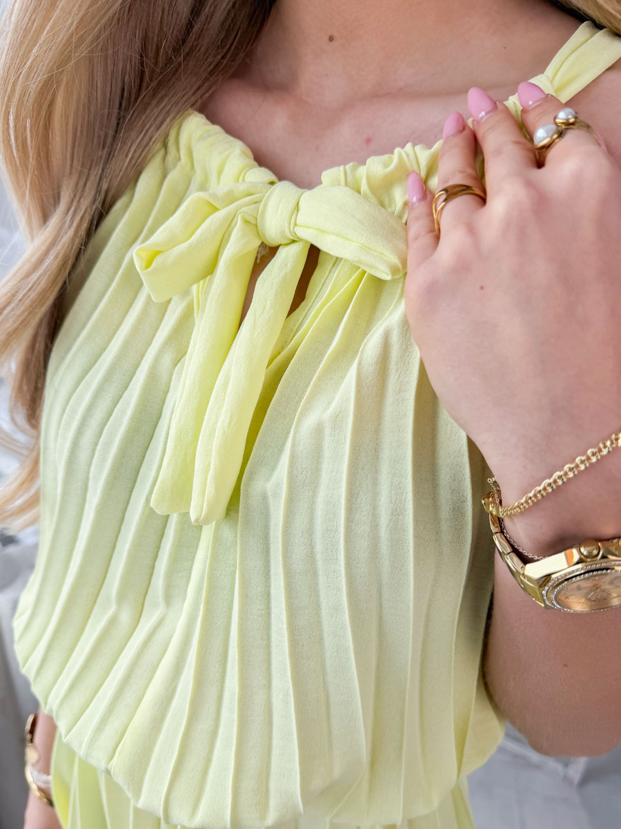 Sukienka plisowana z falbanami Żółta – Plisella to lekka i niezwykle efektowna propozycja, która zachwyca swoją zwiewnością i dziewczęcym urokiem; wykonana z delikatnego, plisowanego materiału pięknie układa się w ruchu, tworząc subtelny, falujący efekt, a ozdobne falbany dodają całości romantycznego charakteru i lekkości, natomiast wiązania przy dekolcie oraz w talii pozwalają na indywidualne dopasowanie do sylwetki, podkreślając jej atuty, a słoneczny, żółty kolor wprowadza świeżość i energię, czyniąc tę sukienkę idealnym wyborem na lato, wakacje oraz wyjątkowe okazje.