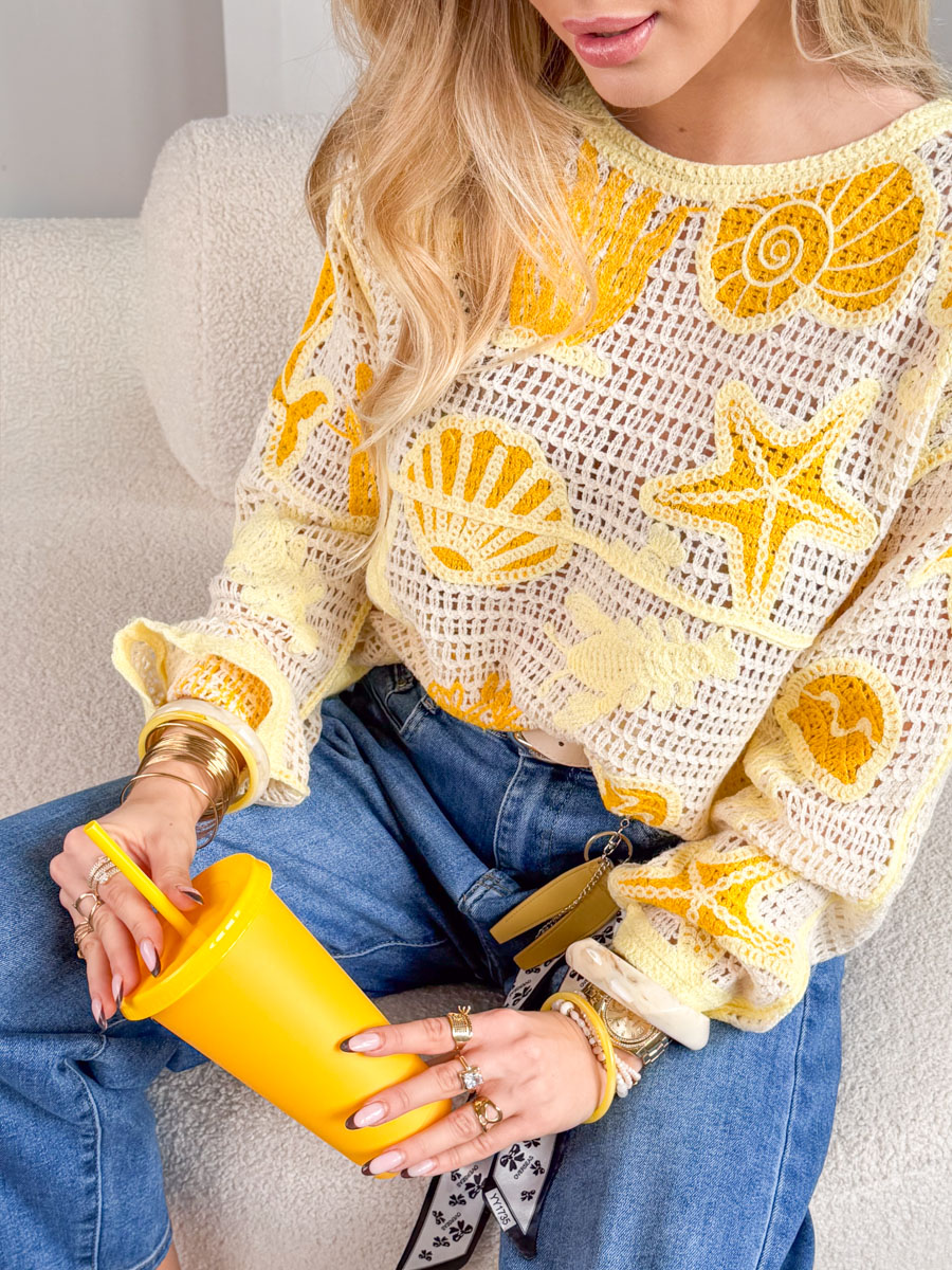 Sweter ozdobnie pleciony Żółty to wyrazista propozycja dla kobiet, które lubią łączyć wygodę z oryginalnym stylem. Wykonany z ażurowej, efektownej plecionki w jasnym, kremowym odcieniu z kontrastującymi, żółtymi motywami inspirowanymi wakacyjnym klimatem, przyciąga wzrok i nadaje stylizacji świeżości. Luźniejszy fason z delikatnie opadającą linią ramion zapewnia swobodę ruchów oraz komfort noszenia, a miękka przędza sprawia, że model świetnie sprawdzi się w cieplejsze dni i sezonie przejściowym. Doskonale komponuje się z jeansami, szortami czy lekką spódnicą, tworząc modny, swobodny look na co dzień i na letnie wyjścia.