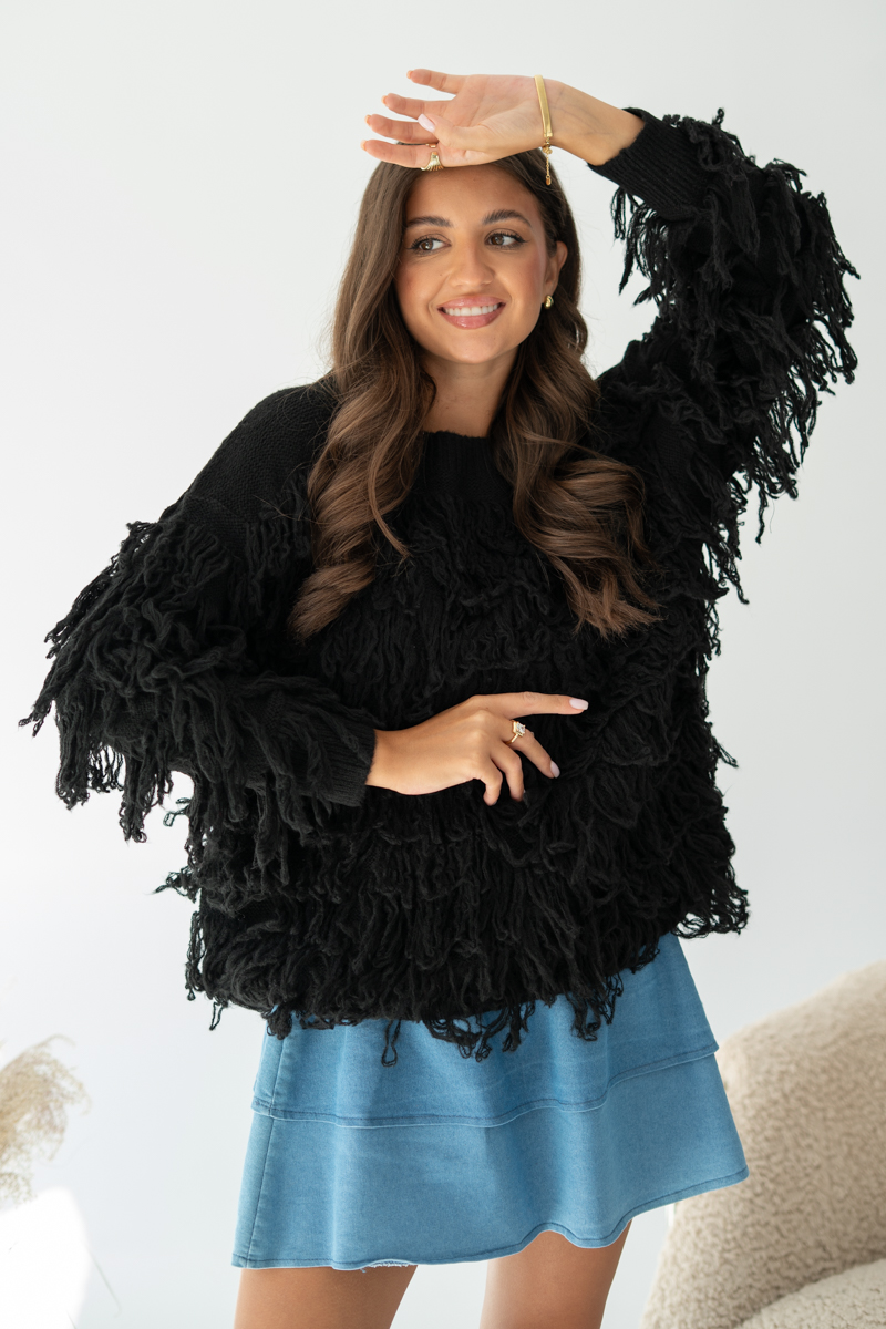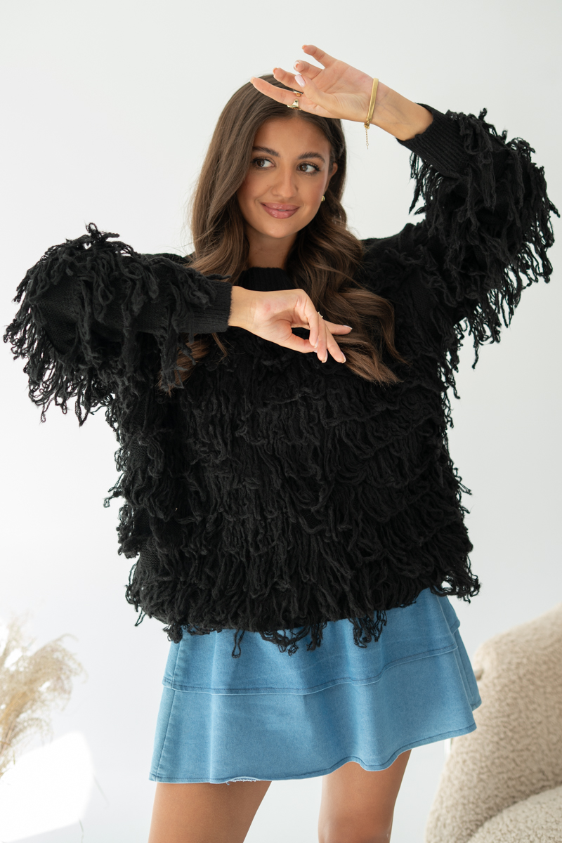 Czarny sweter Solyssa z frędzlami w stylu boho to wyjątkowy model, który wyróżnia się oryginalnym wykończeniem i luźnym krojem. Wykonany z miękkiego materiału, zapewnia wygodę noszenia i przyjemne otulenie w chłodniejsze dni. Frędzle rozmieszczone na całej powierzchni nadają mu lekkości i modnego, artystycznego charakteru. Doskonale sprawdzi się w codziennych stylizacjach, a także w bardziej efektownych zestawieniach w duchu boho. Idealny do jeansów, spódnic czy botków, pozwoli wyróżnić się i dodać stylizacji oryginalnego akcentu.